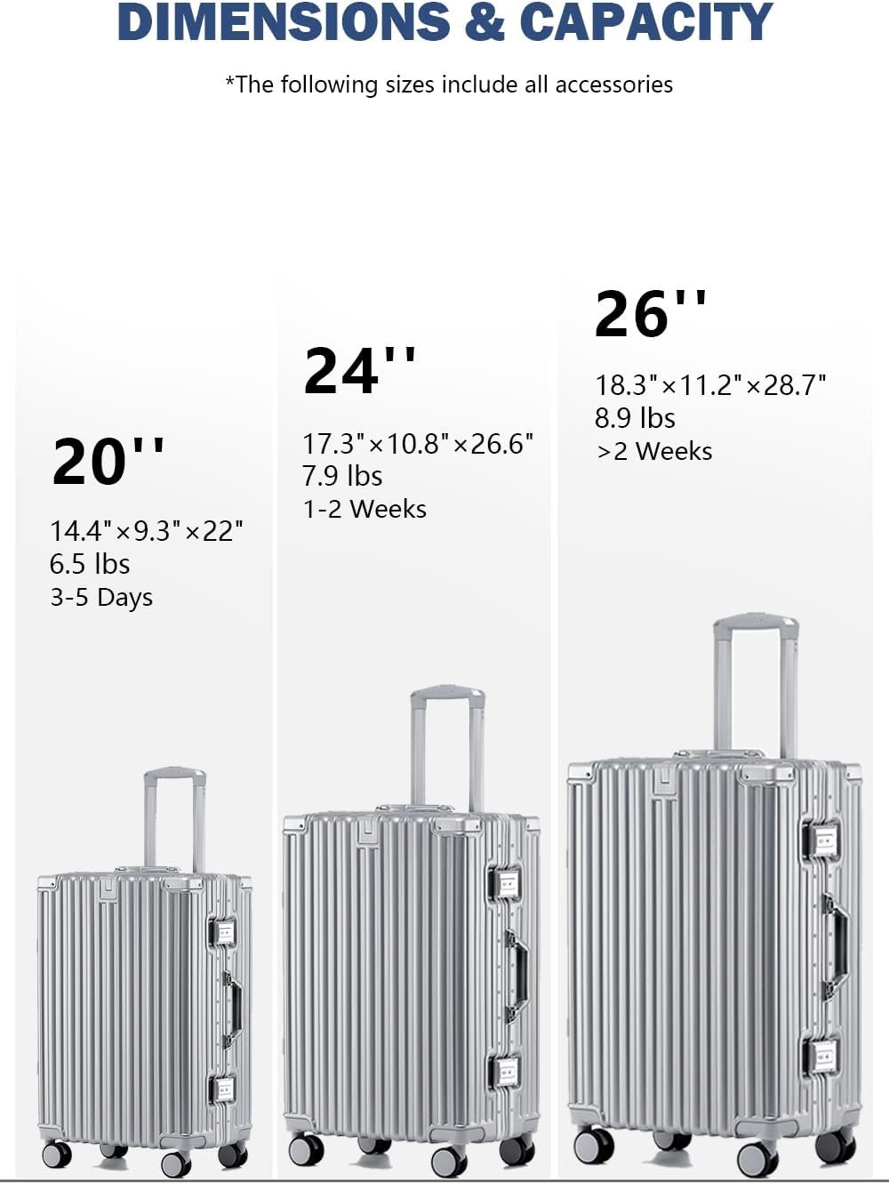 OVERALL DIMENSION: The size of the 20 inch carry on luggage: 22×14.4×9.3 IN. Weight: 6.5 LB. Capacity: 40L (Including spinner wheels, handle, accessories, etc.)