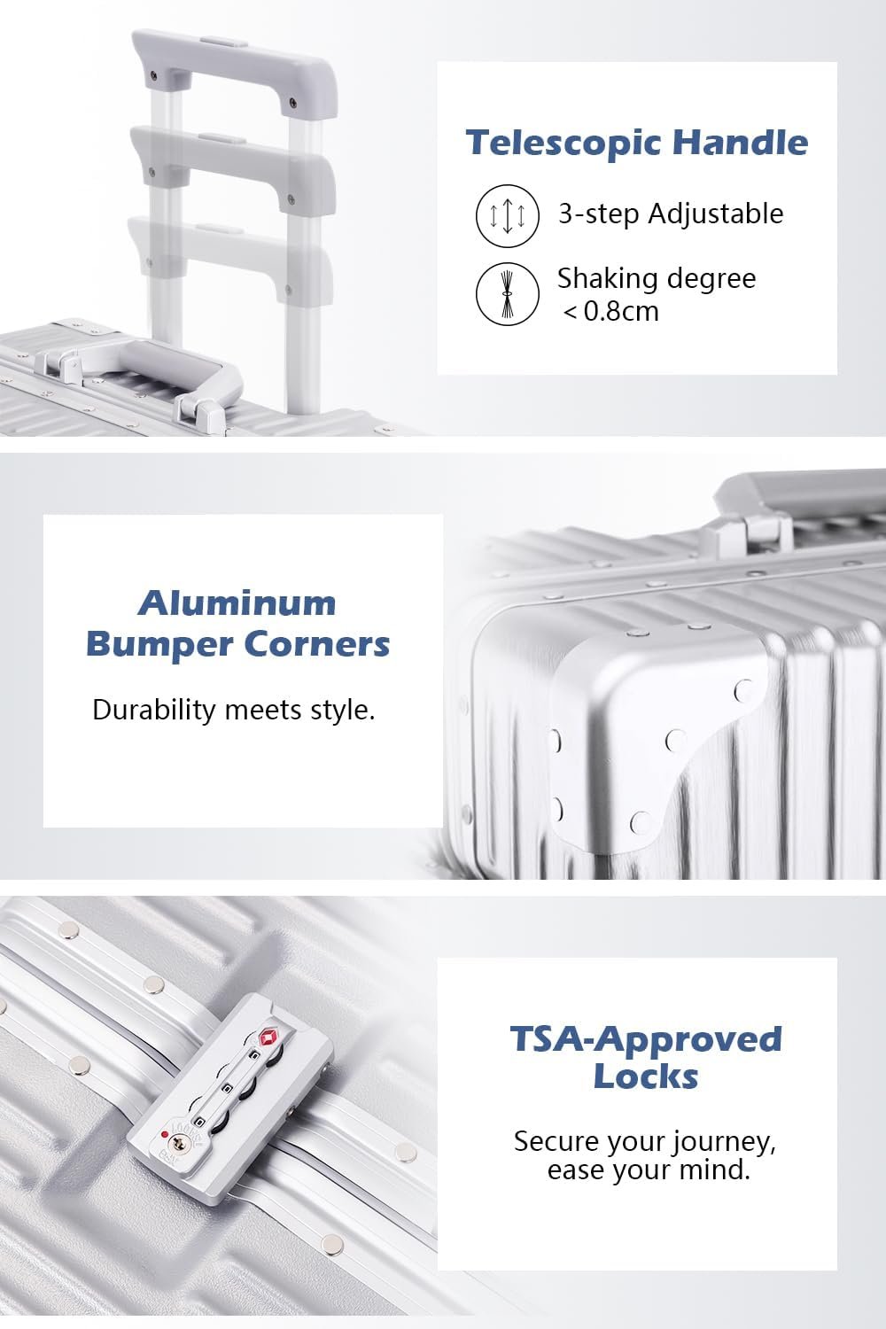 ADVANCED ZIPPERLESS DESIGN: Our zipperless aluminum frame suitcase offers effortless access and enhanced protection. Secure latches replace traditional zippers, eliminating security concerns and stuck zippers. Perfect for travelers seeking peace of mind and convenience during their journeys.