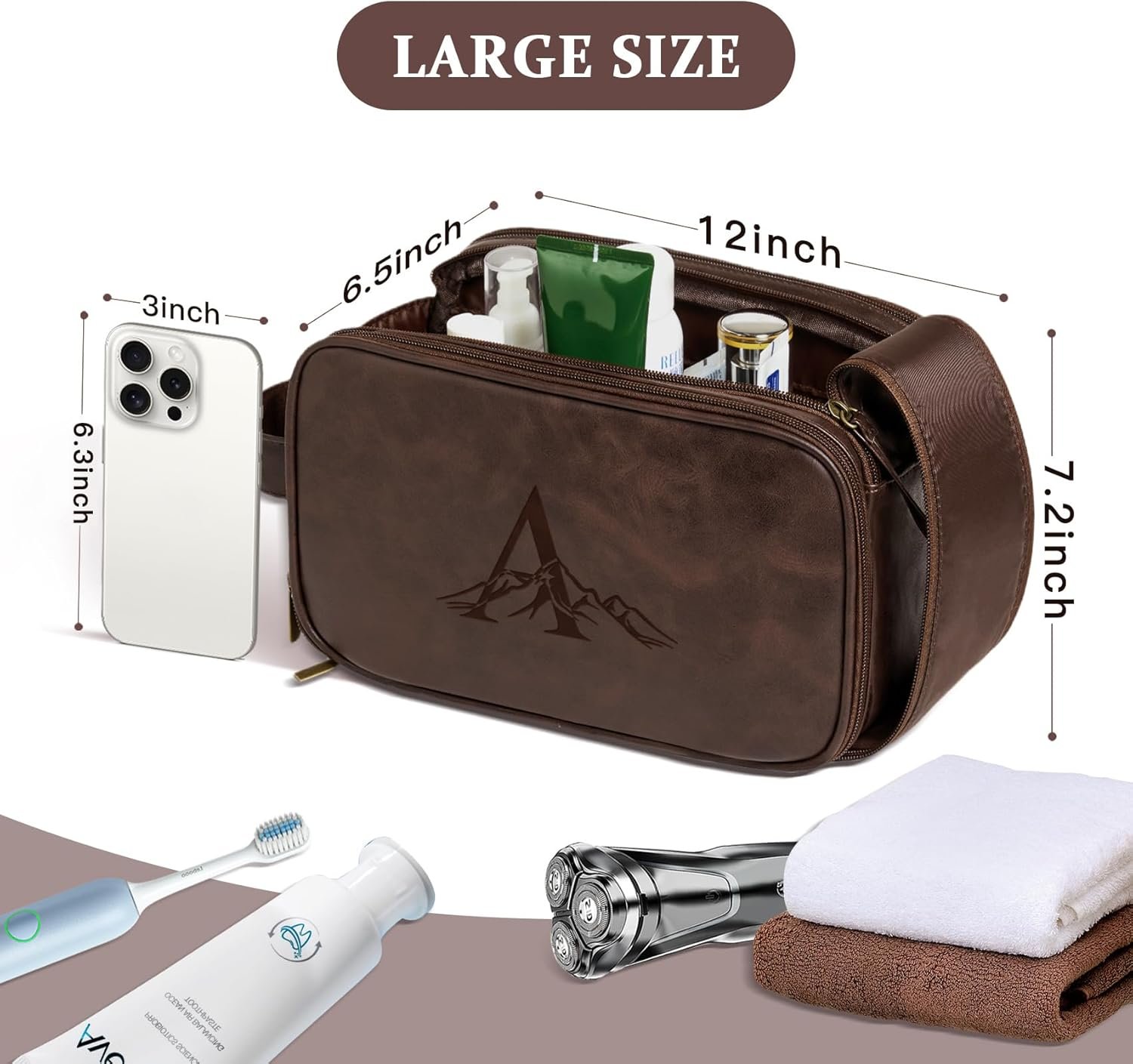 🎁【Waterproof & Large Capacity】The personalized travel size toiletries bag is handmade of PU leather that offers natural texture with super water-resistance. Multiple areas of makeup organizer will be perfecrt for storing more items. DIMENSIONS – 12” (Length) x7.2” (Height) x 6.5” (Width). Weight: 0.9 LB. Extra-large capacity toiletry box for traveling can hold all your grooming, shaving and toiletry necessities, yet compact enough to easily pack in your travel bag