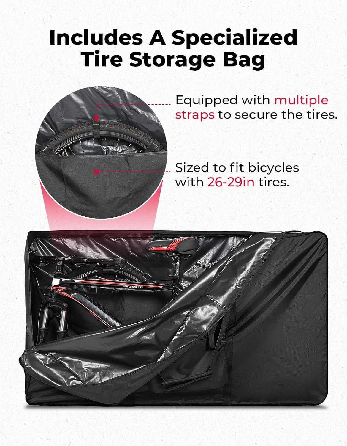Dedicated Tire Storage Bag: Inside the bike transport case, there is a specialized compartment for storing tires, suitable for bicycles ranging from 26 to 29 inches. It is equipped with multiple straps to secure the tires, preventing them from moving around. This design keeps your bike clean and prevents any scratches