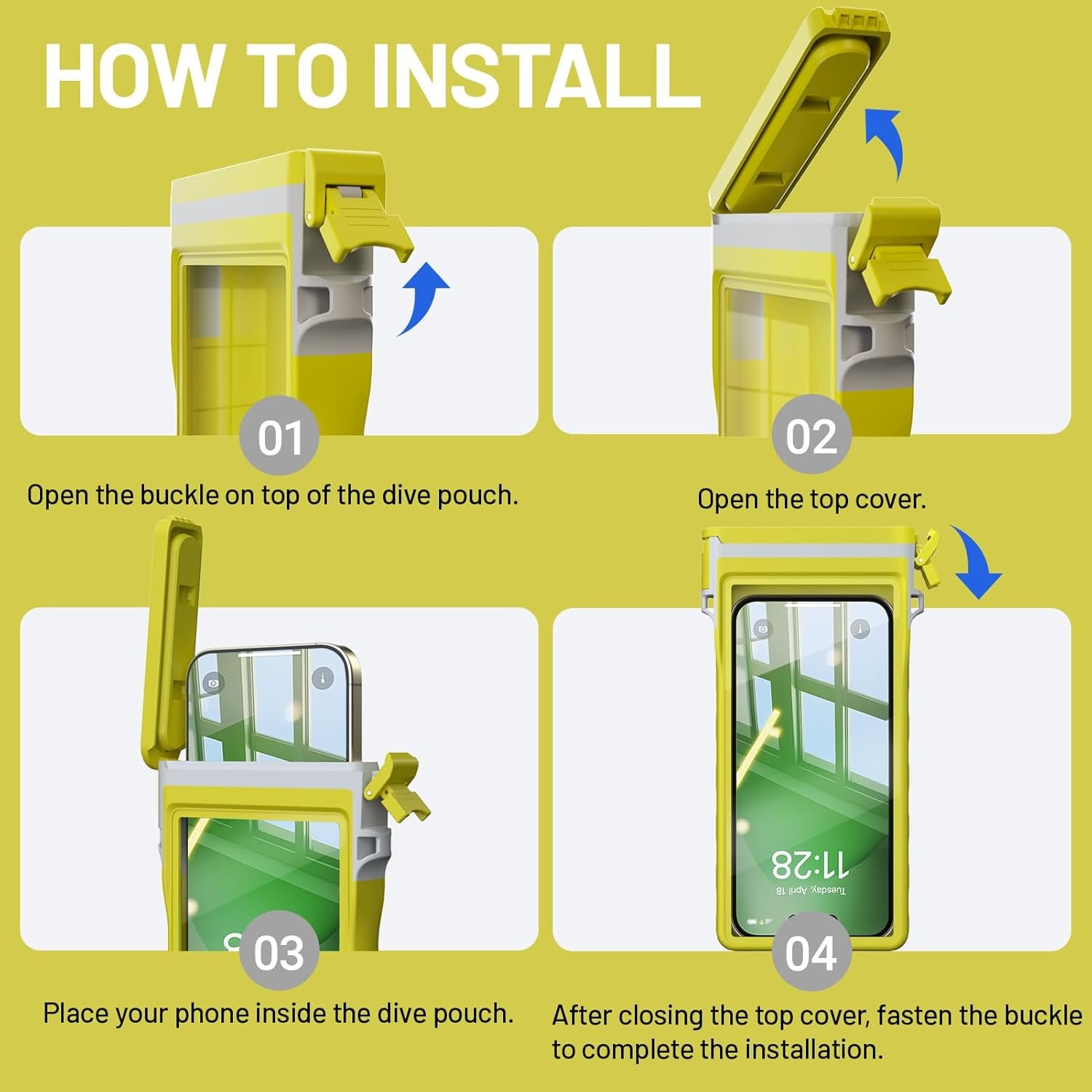 Open the buckle one top of the floating cell phone pouch;Open the top cover of the cell phone dry bags;Place your iphone or other smart phones inside the diving phone case; (Important Note: Remove Phone Case Before Use)After closing the top cover, fasten the buckle to comeplete the installation.