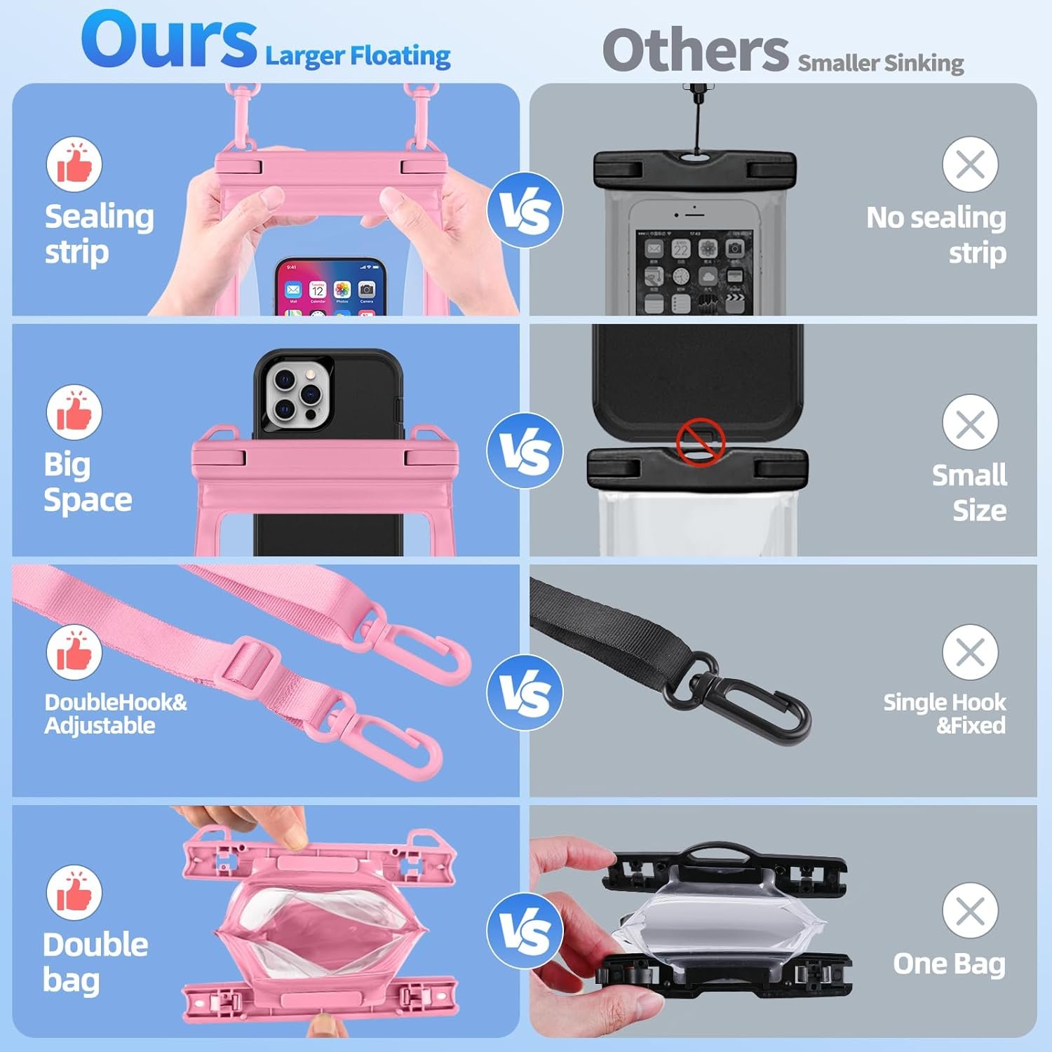 SECURE DOUBLE HOOKS & ADJUSTABLE LANYARD: Our waterproof phone pouch is equipped with double hooks for added strength and security. The adjustable lanyard with versatile straps allows you to wear the pouch around your neck, or as a crossbody or shoulder bag for hands-free convenience. Make the most of your water activities while keeping your phone safe. But always test the waterproof pouch before use by soaking tissue inside for 10 minutes