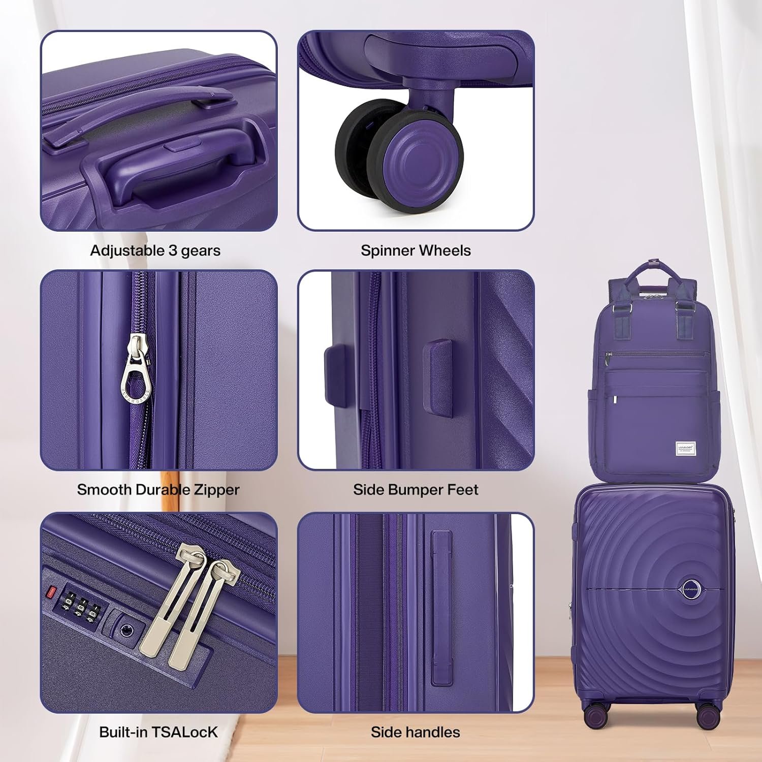 LARVENDER Luggage Sets 3 Piece, 20in Carry On Luggage, PP Hardshell Suitcase Set, Expandable Luggage with Spinner Wheels, Carry On Suitcase With Travel Backpack for Men Women(GRAPE PURPLE/20/BP/TB)