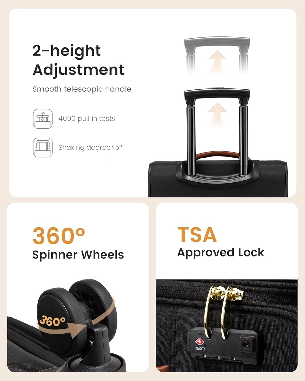 【Secure & Reliable Travel Companion】: Glide smoothly through bustling airports with our carry on luggage featuring 360° spinner wheels, designed for silent and durable travel. The telescopic handle, made from aircraft-grade aluminum, offers two adjustable heights to reduce wobble. Equipped with a TSA-approved lock, this suitcase with wheels ensures your essentials are secure and compliant with airport screenings.