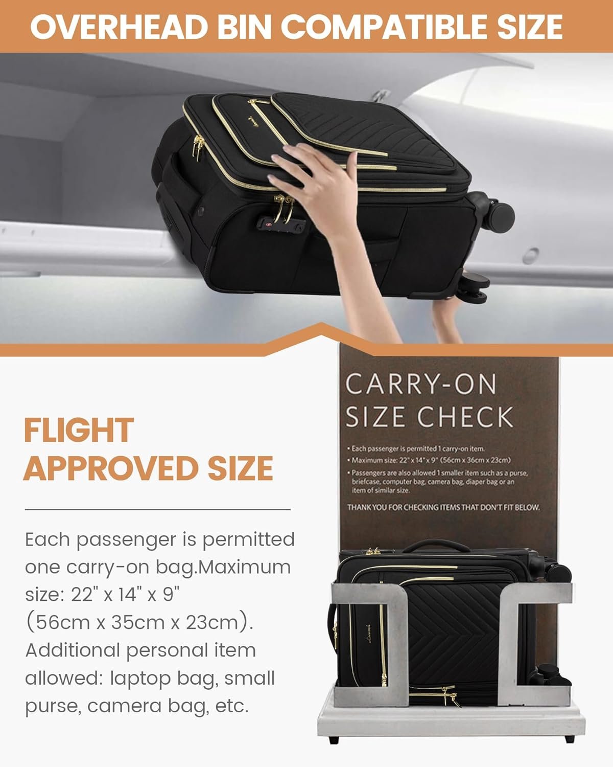 【Airline Approved Dimensions】This large suitcases with wheels measures 21.65 x 9 x 13.78 inches (including wheels), weighing 6.7 pounds, and is crafted to meet the size requirements of most major airlines, fitting comfortably in overhead bins. Ideal for stress-free travel, it meets check-in size restrictions for airlines such as American Airlines, Delta Airline, United Airline, Southwest Airline, Hawaiian Airline, and Alaska Airline, etc.