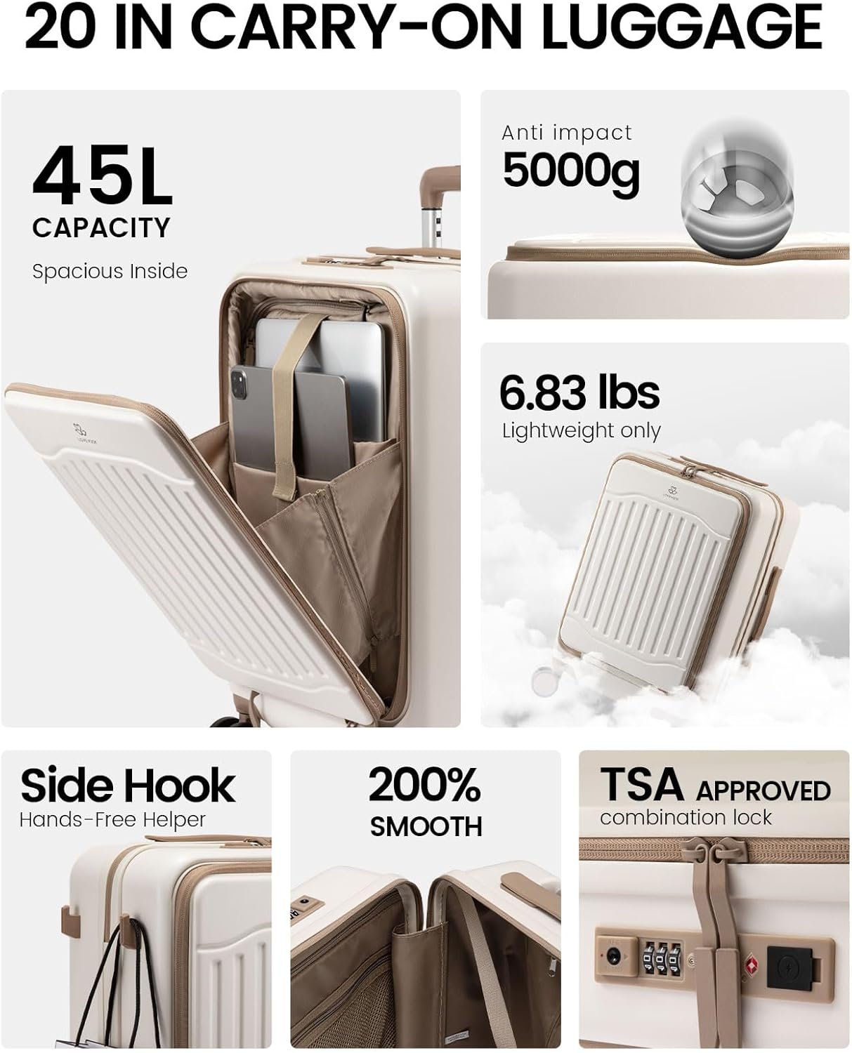【DIMENSION】This 20 inch carry on luggage measures 20.9″x13.8″x9″(Includes wheels) and weighs only 6.9 lb, with a spacious 45L capacity. It fits in most overhead bins. Whether you’re boarding domestic or international flights, this small suitcase with wheels is perfect for short business trips, weekend getaways, or daily commutes.