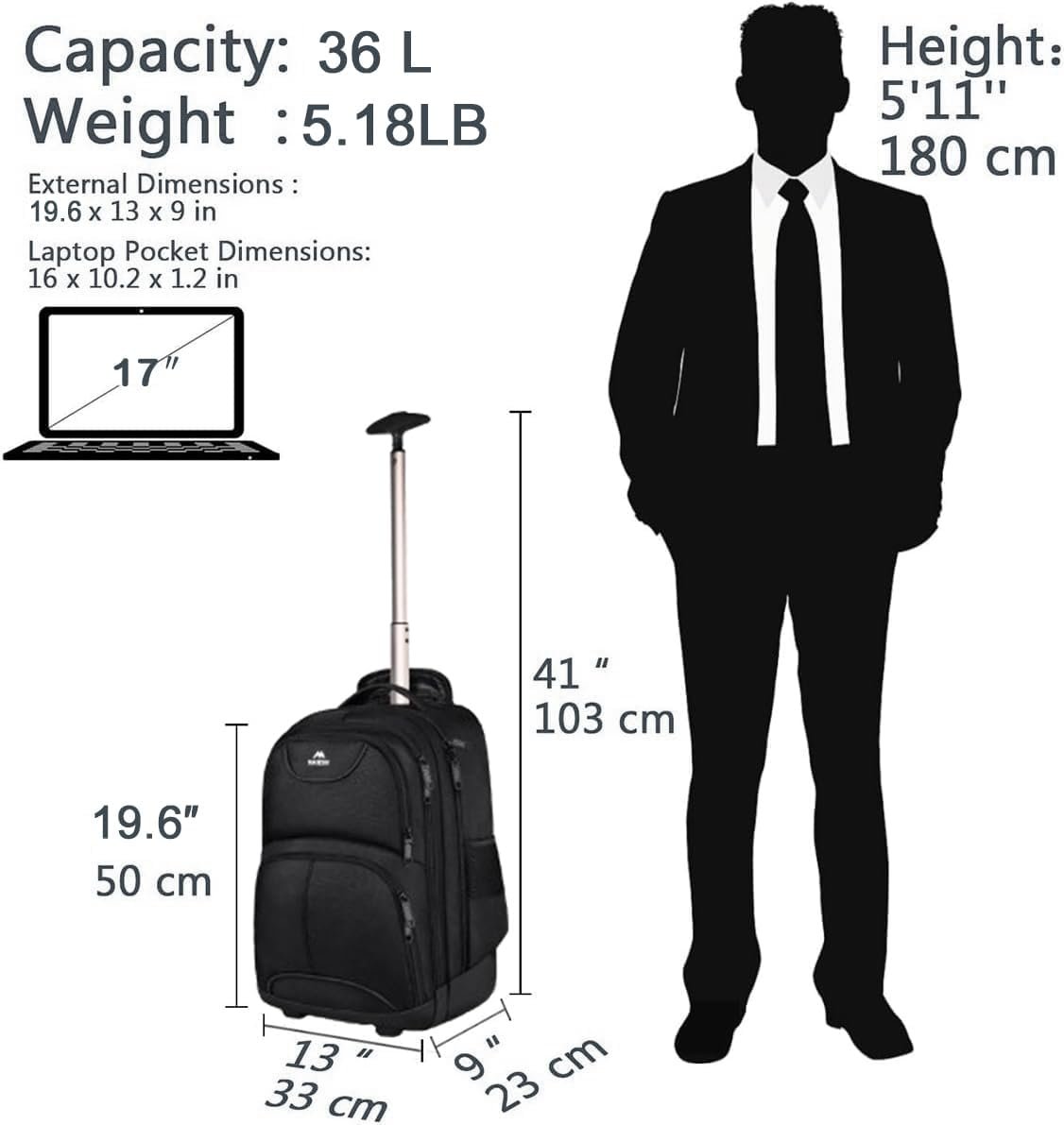 COMPARTMENT: This backpack with wheels built-in separate laptop pocket can hold laptops up to 17 inch as well as 15.6 inch, 14 inch and 13 inch Macbook. This large rolling backpack has 36 L Large Main Compartment roomy hold clothing for trip; Second zippered file compartment to organize files; Organizer Compartment with many pockets make your items organized and easier to find; Mesh water bottle pockets at sides; A magic tape pocket at the back is convenient to carry a small towel