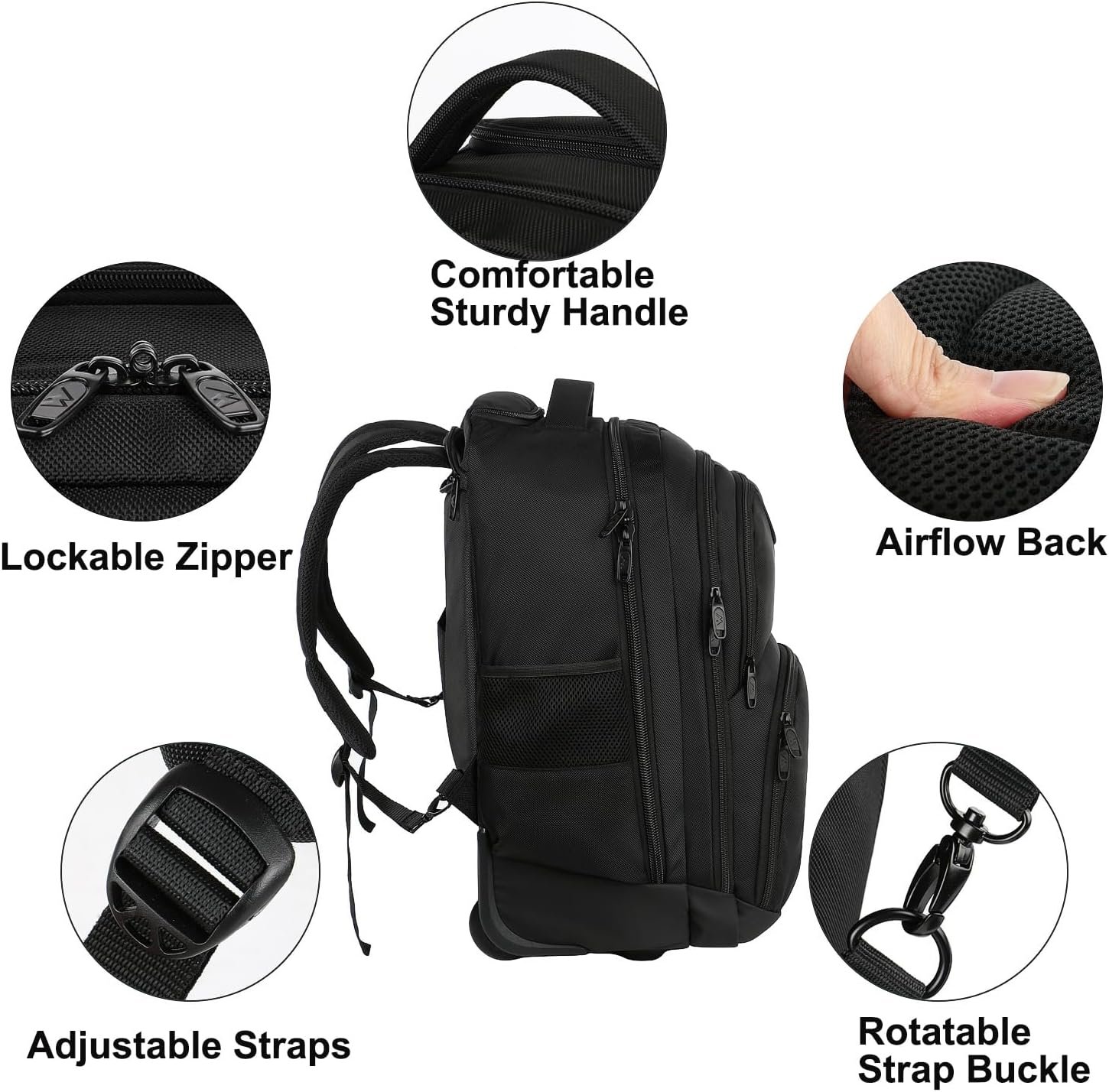 RELIABLE MATERIAL: This wheeled backpack for adults is well made of sturdy polyester fabric with metal zippers and waterproof bottom panel corner guards and a kick plate; Adjustable padded shoulder straps with sturdy metal Hooks; Sturdy Aluminum Telescoping Handle and Strong & reliable rubber backpack wheels