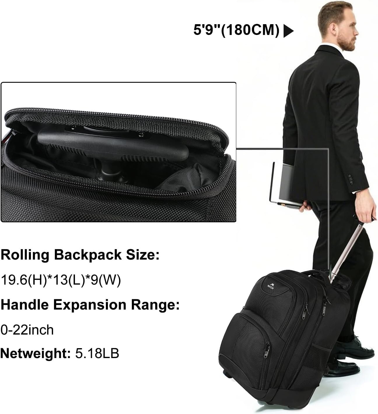 Dimensions: EXTERIOR DIMENSIONS–19.6 X 13 X 9 inches, Item NET WEIGHT: 5.18 pound(2.35kg); 22 inch Aluminum Hideaway Telescoping Handle can freely adjust the length at your needs. This large travel backpack with wheels is suitable for adults, men, women, Great gifts choice for Valentine’s Day gifts, Mother Day gifts, gifts for father, Thanksgiving Day gifts, Christmas gifts, Birthday gifts, Teacher gifts, Anniversary gifts