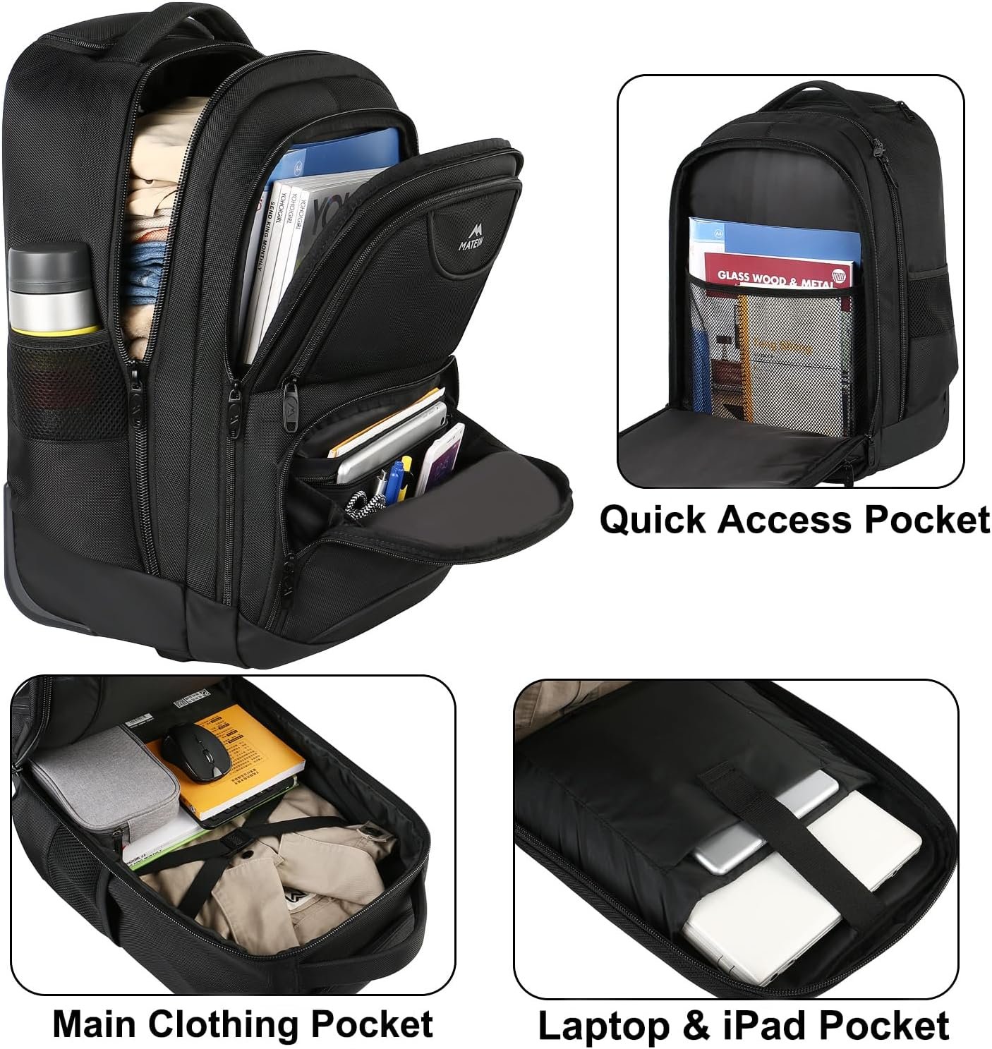 MATEIN Rolling Backpack, 17 inch Water Resistant Wheeled Laptop Backpack, Carry on Luggage Business Bag, Overnight College Computer Bag Trolley Suitcase for Men Women Adults to Travel, Black