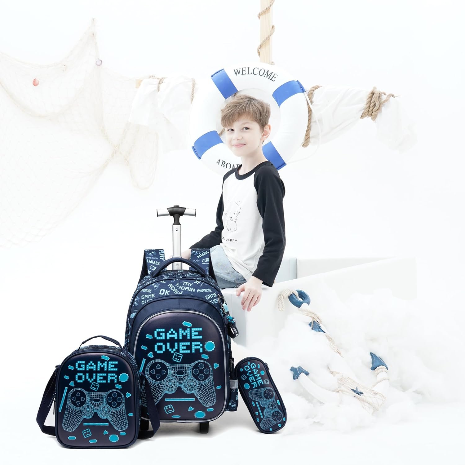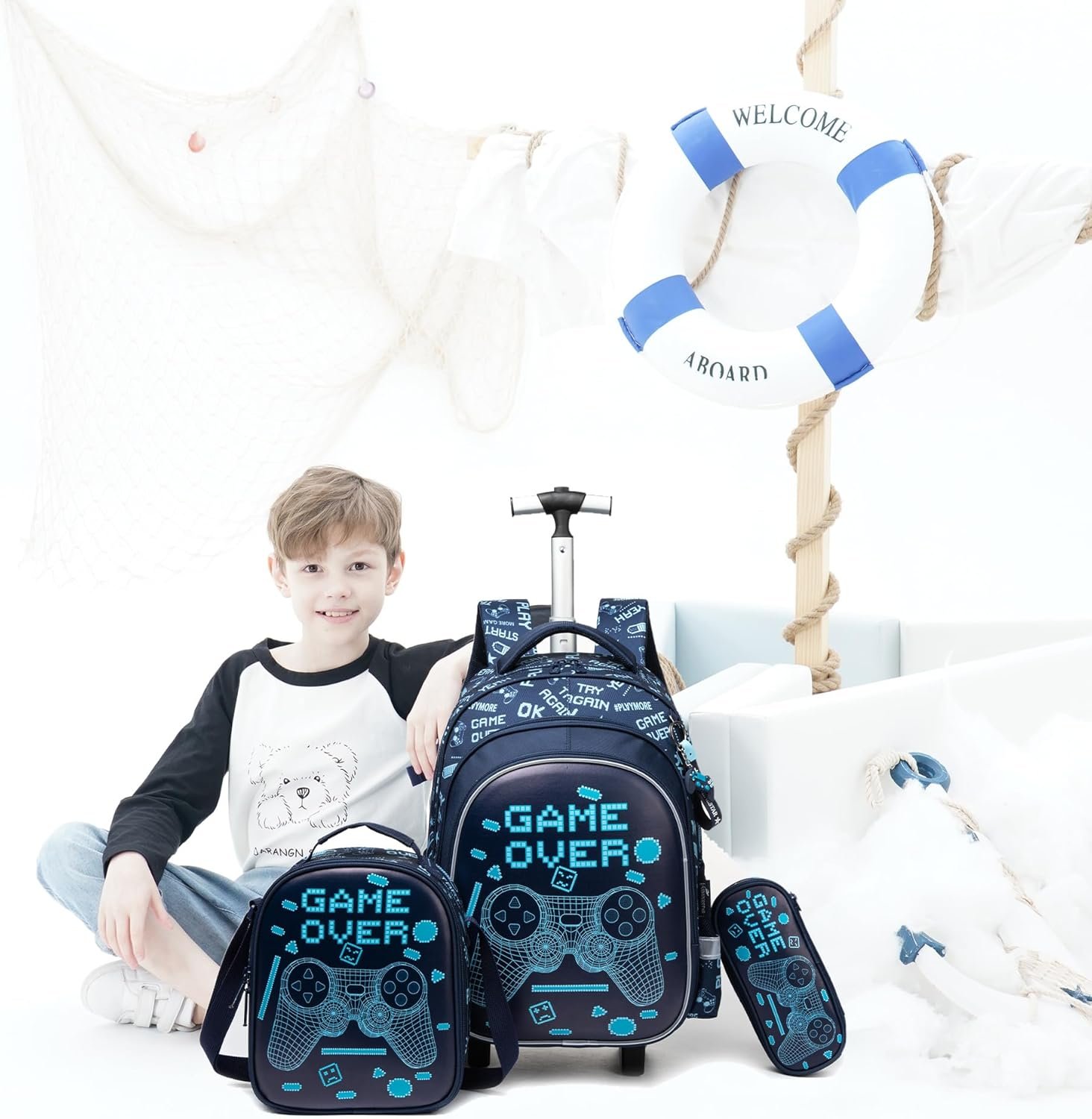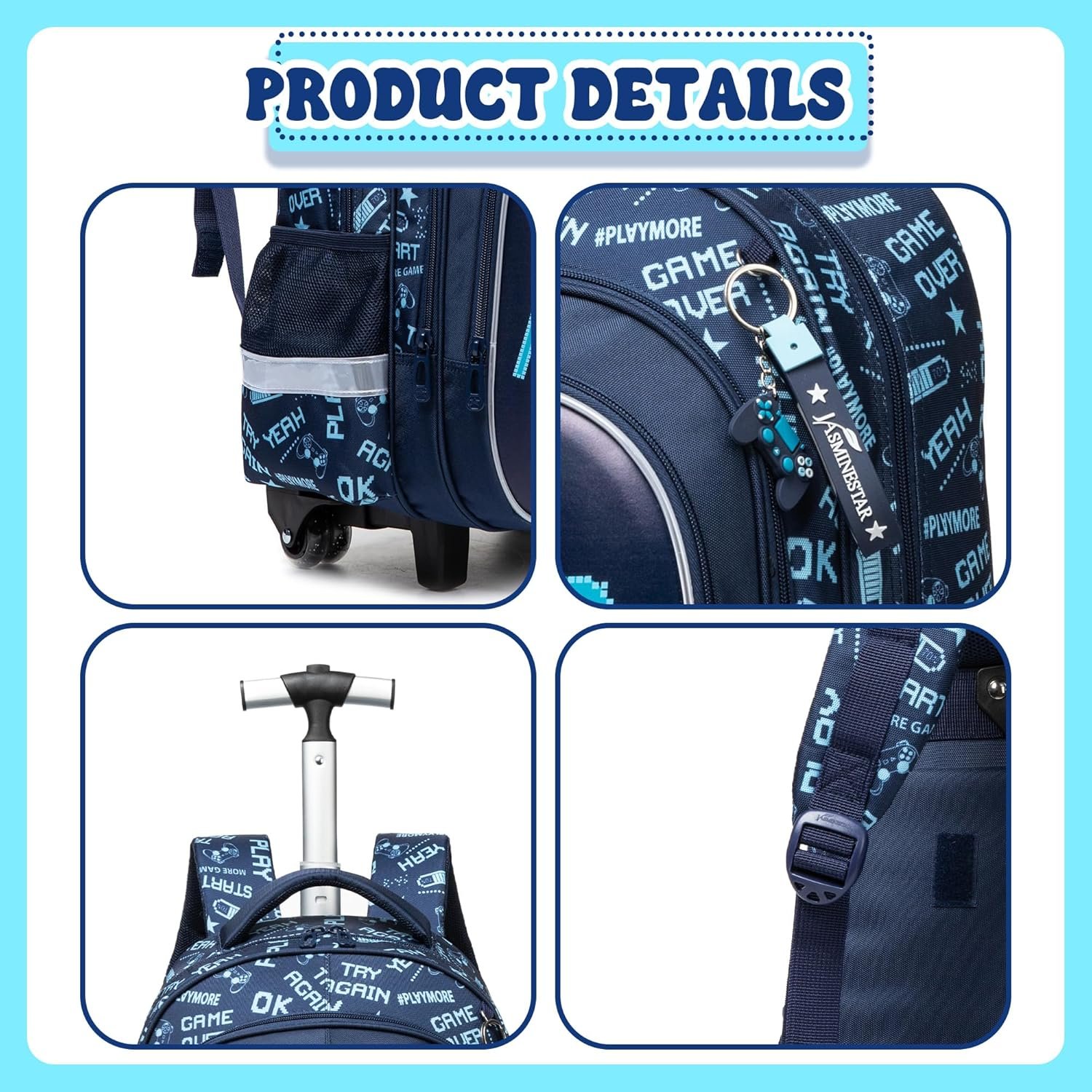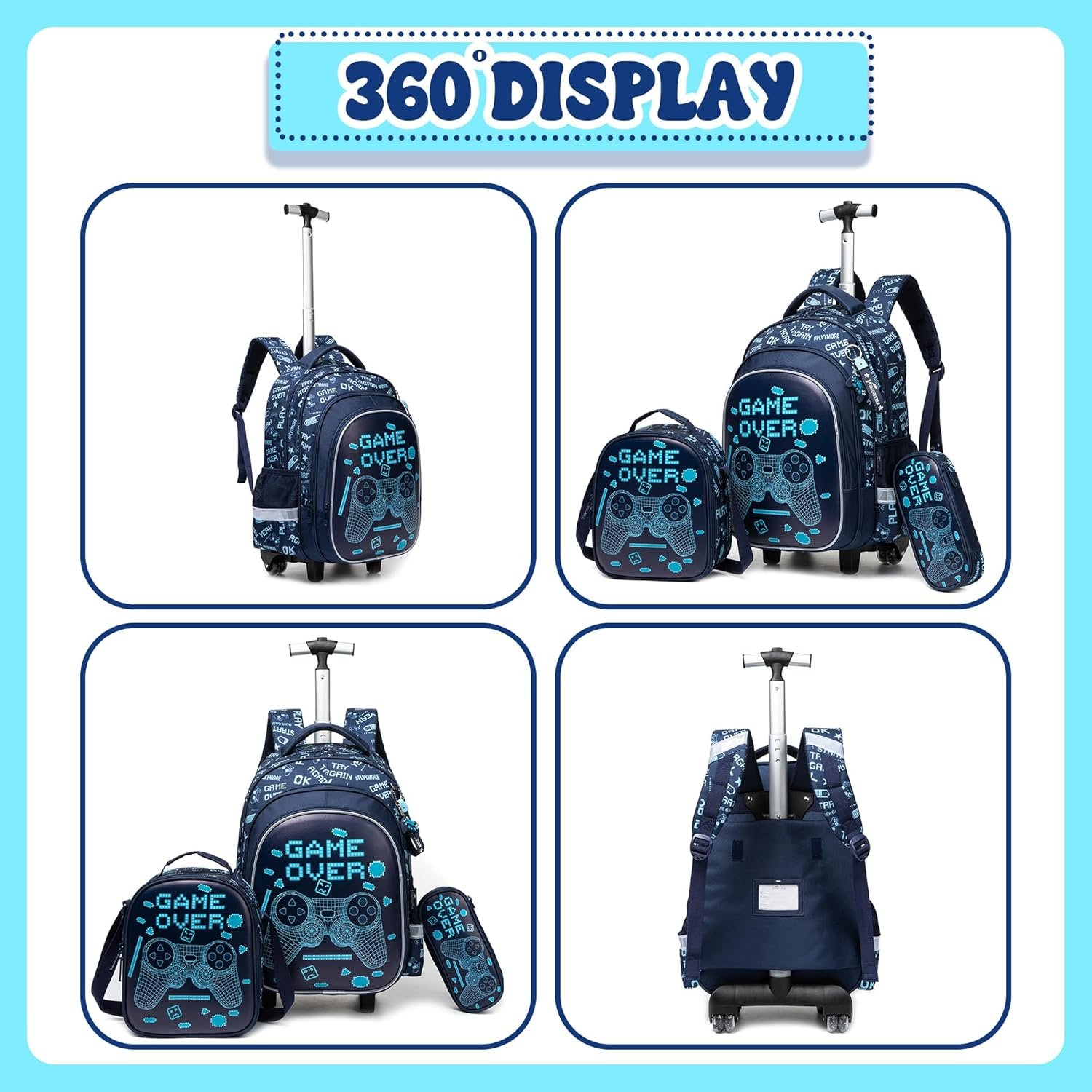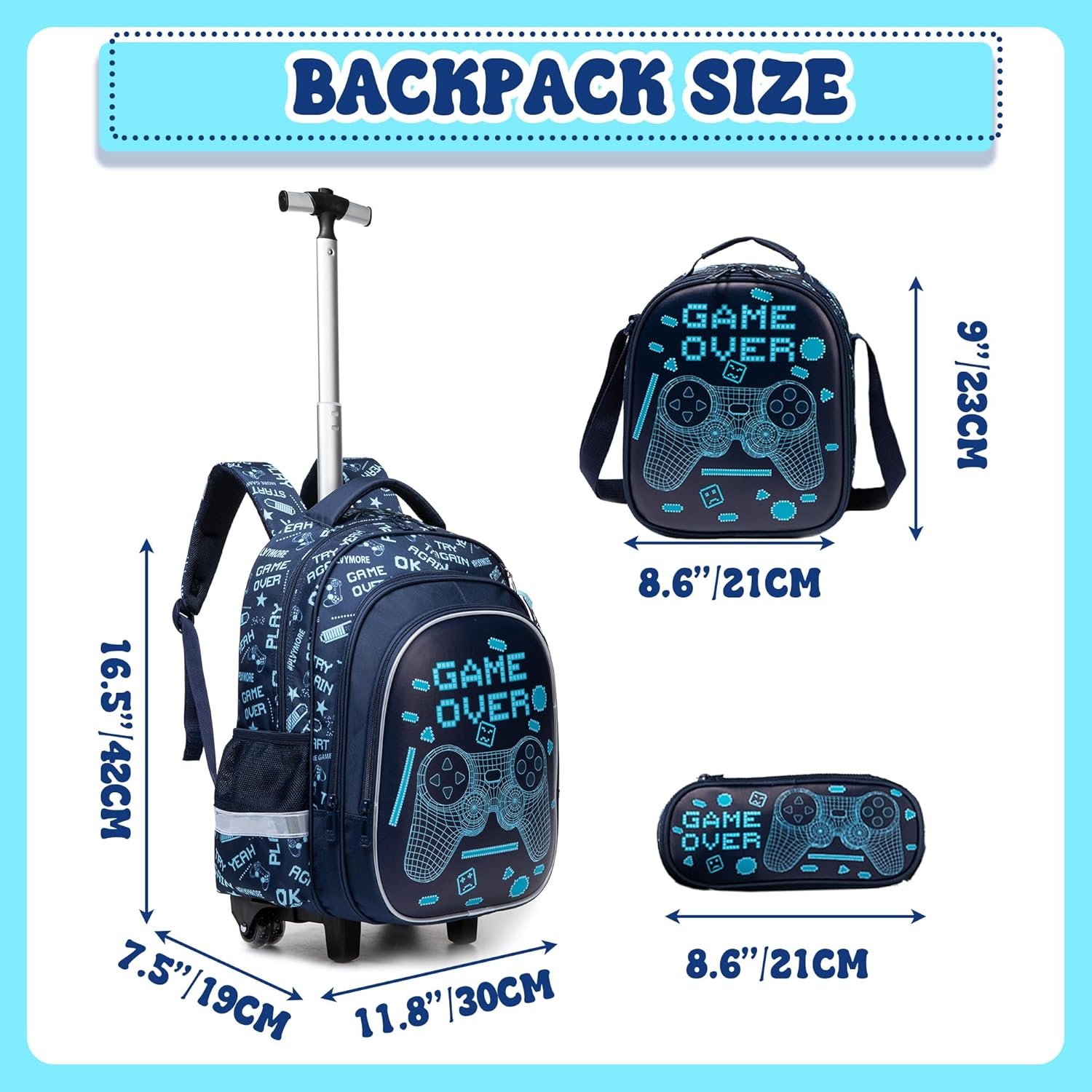 Boys Rolling Backpack Size:backpack:16.5″x11.8″x7.5″,lunch bag:9″x8.2″x4.3″,pencil case:8.6″x3.9″x2.3″,highest height of trolley is 31.5″;Multi-function for kids,as a luggage to reduce load,or as a backpack,or a handbag with a handle on the top of backpack.