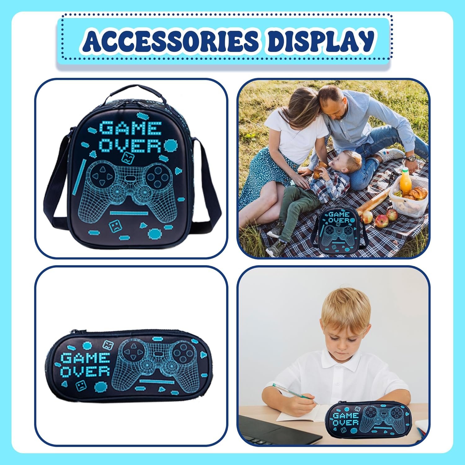 Big storage capacity with multi pockets:1 large main pocket with 1 zipper front pockets.2 mesh pockets for water bottles;1 special pencil case which can hung on the backpack;1 lunch bag with adjustabel straps which can be as shoulder bag or a handle bag.