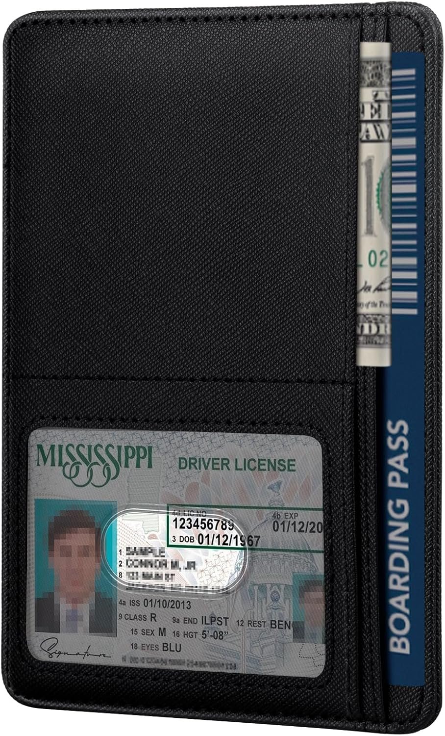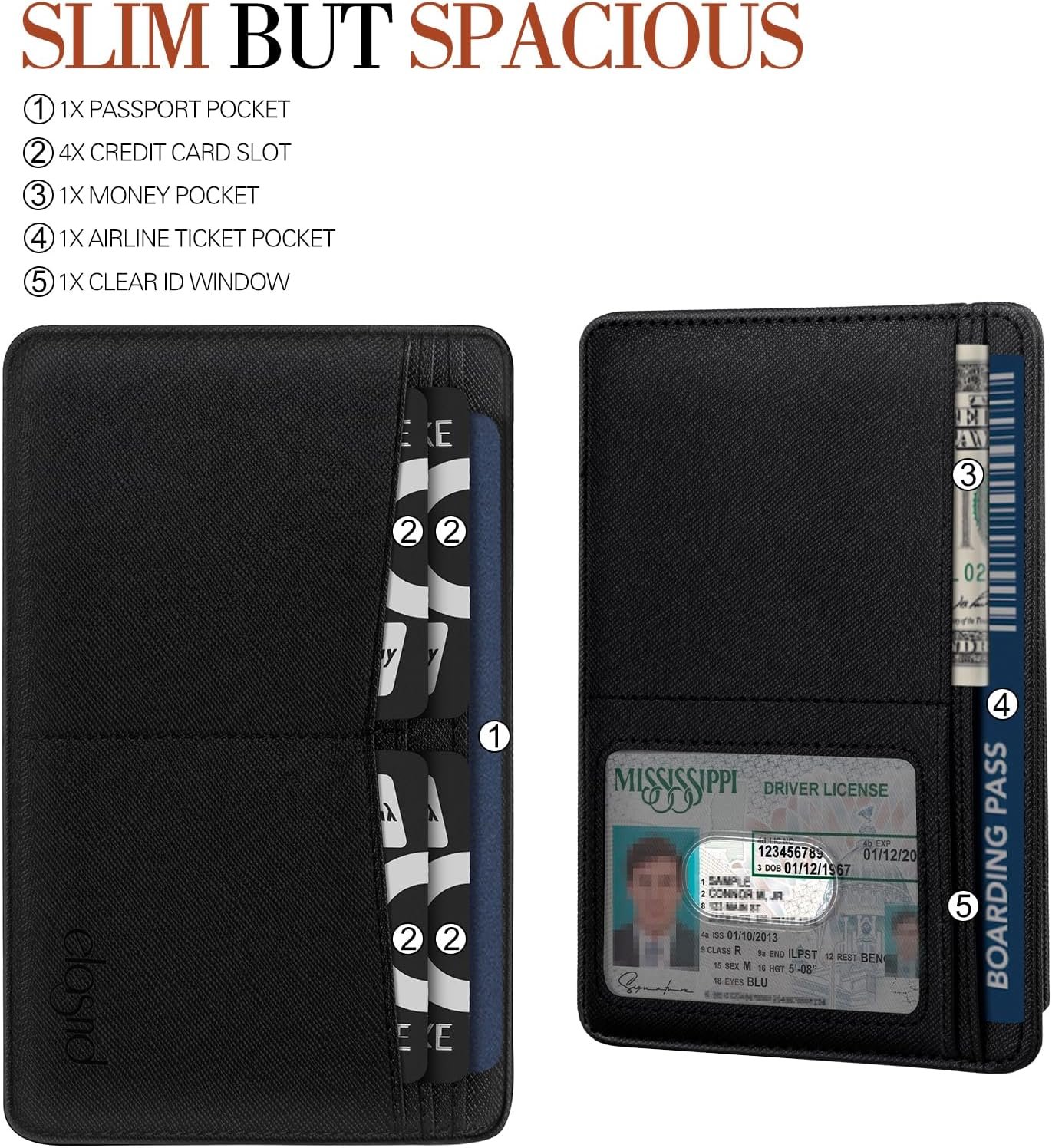 ORGANIZED STORAGE: 1 passport slot, 4 vertical card slots (up to 4 cards), 1 bill pocket (holds 6+ folded USD), and 1 anti-slip ID window