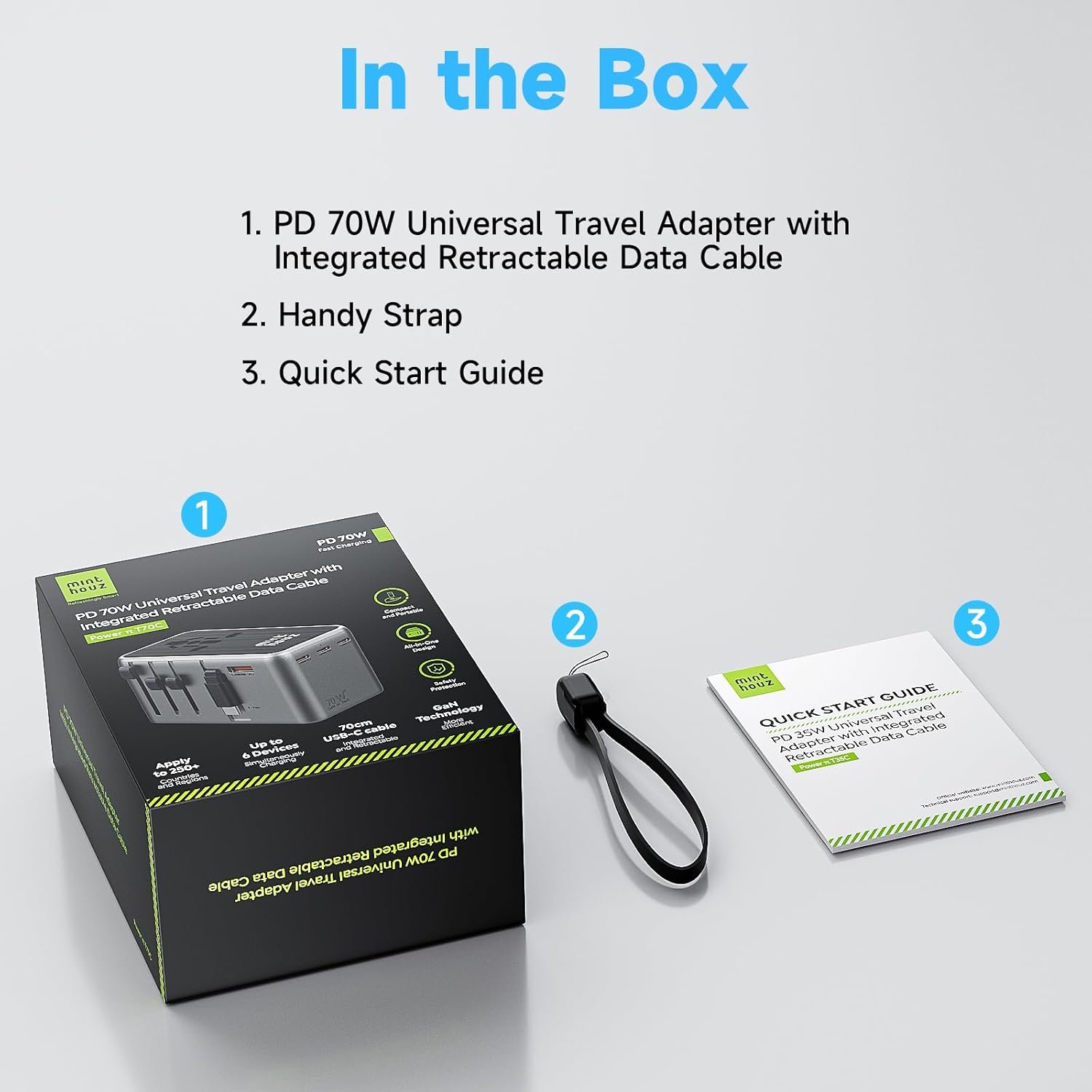 Minthouz Universal Travel Adapter, International 70W Power Adapter GaN Fast Charger with 3 USB-C PD, 1 USB-C Cable & A Ports, All-in-One Portable AC Power Plug Adapter for USA EU UK AUS