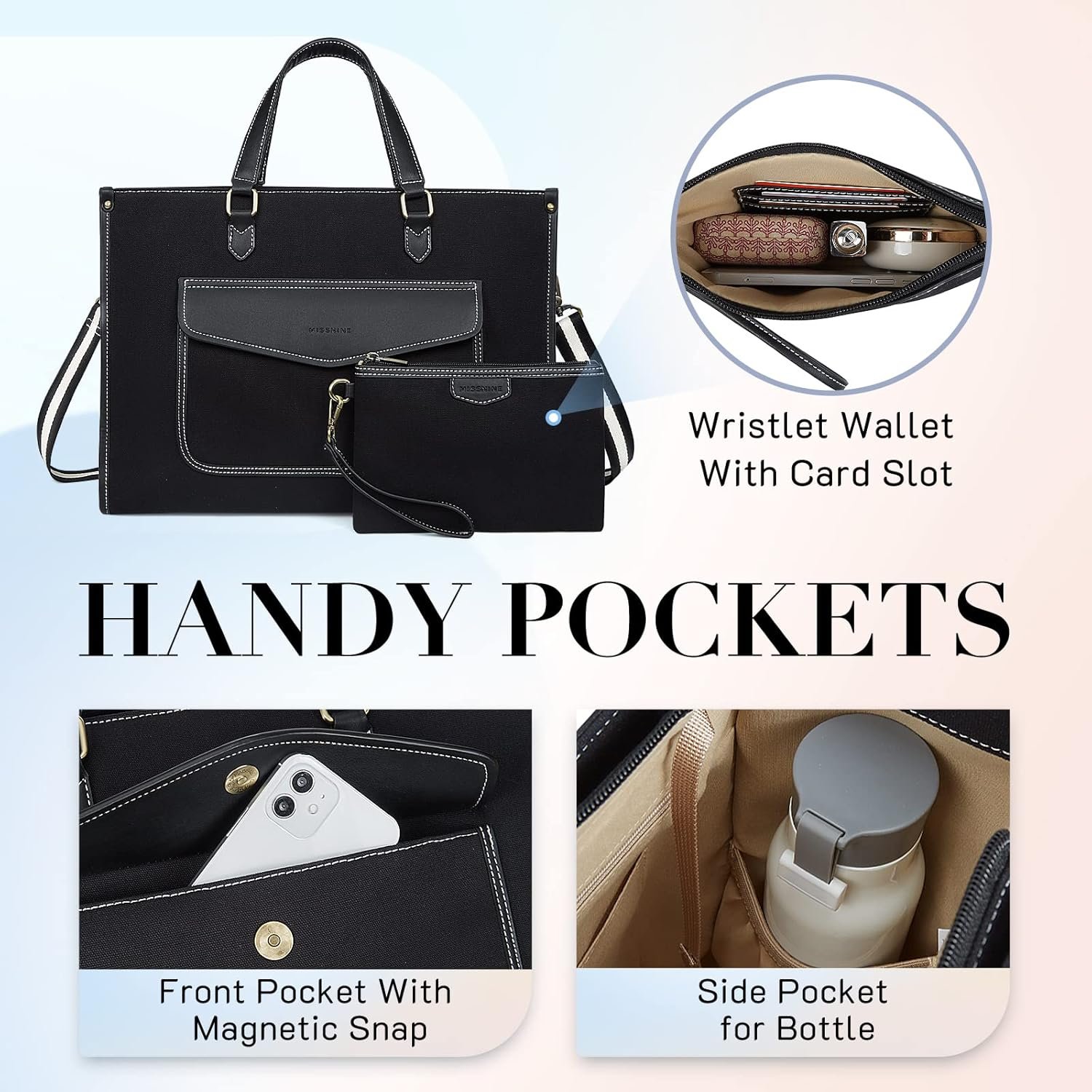 Missnine Tote Bag Canvas Laptop Bag for Women 15.6 inch Casual Work Bags with Clutch Purse Computer 2 PCS Set (Black_2pcs)