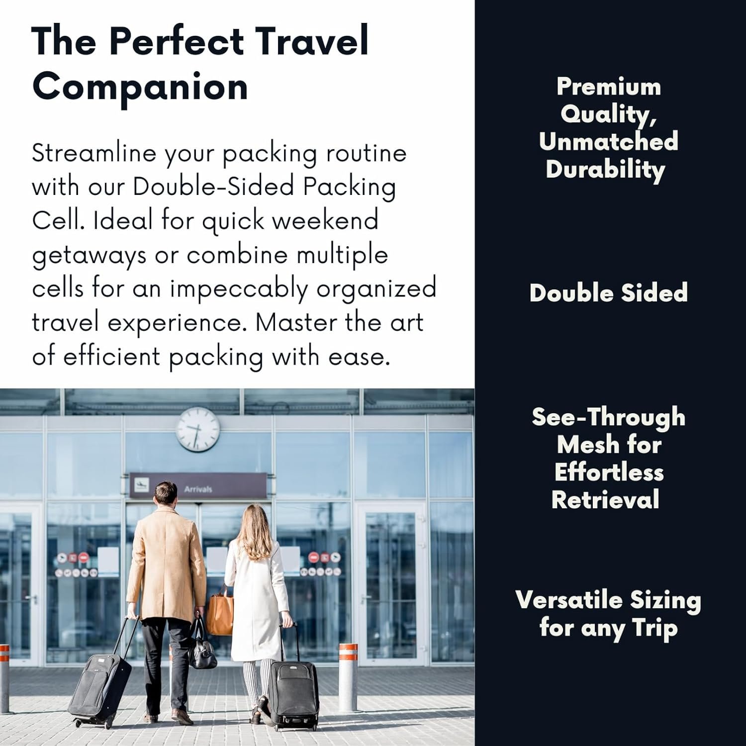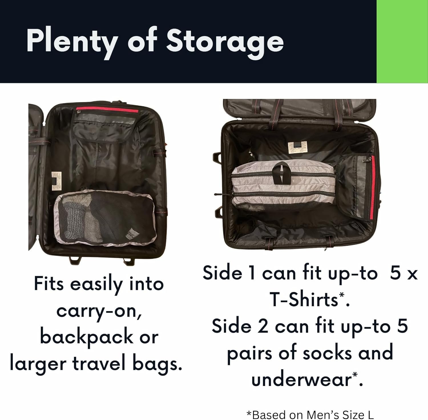 VERSATILE SIZING FOR ANY TRIP: Our Double-Sided Packing Cube is perfectly sized to fit snugly in your suitcase, keeping your belongings impeccably organized. An ideal choice for carry-on and checked bags, making it a versatile companion for all types of travelers.