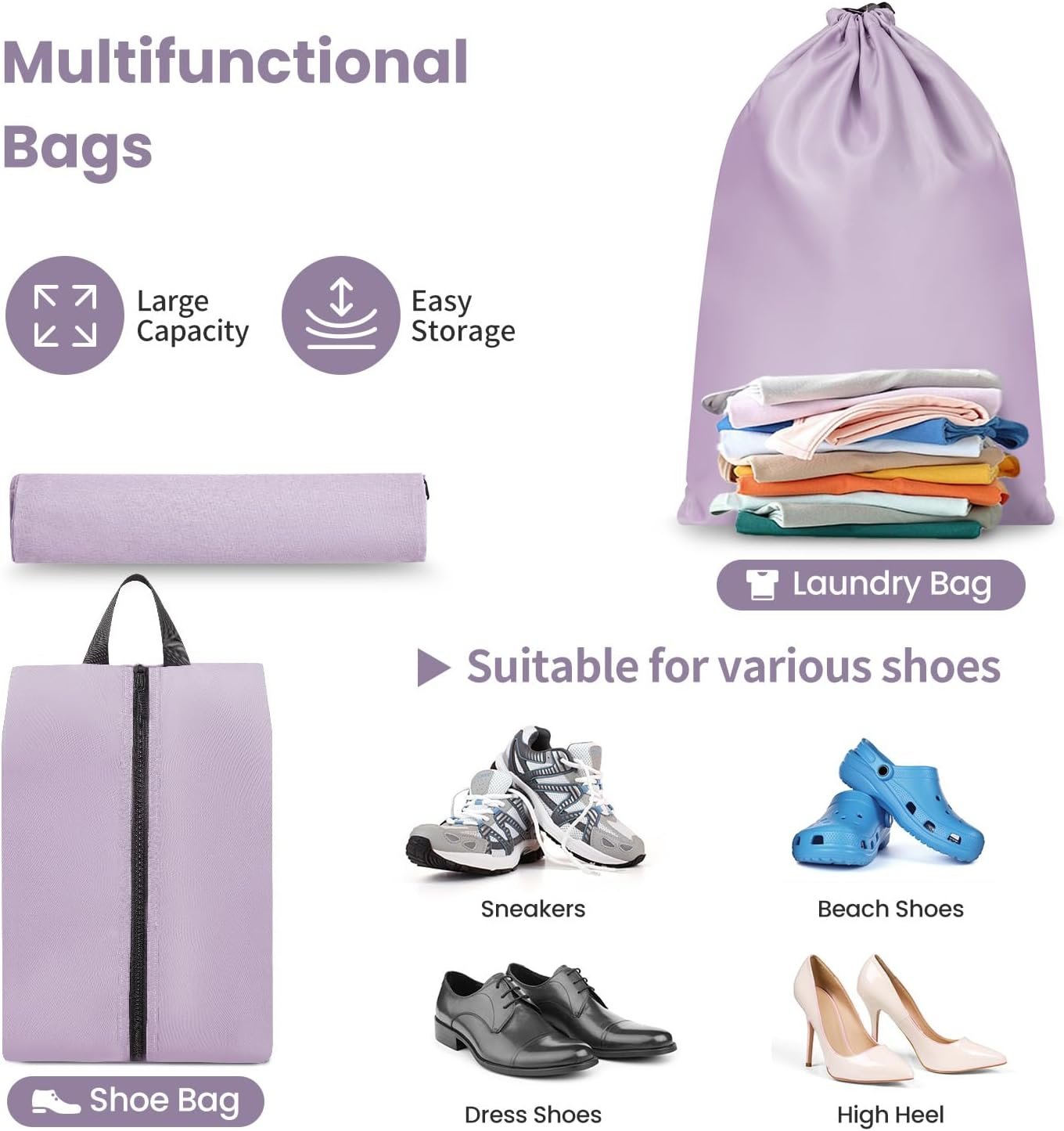 Comprehensive Suit: Comes with a complimentary makeup bag and a single pouch for the convenient organization of cosmetics, skincare products, and other small items, helping you stay neat and organized. Additionally, the set includes a dedicated lingerie bag for storing underwear to prevent damage and tangling, as well as a shoe bag for easy storage of shoes, ensuring your luggage stays orderly.