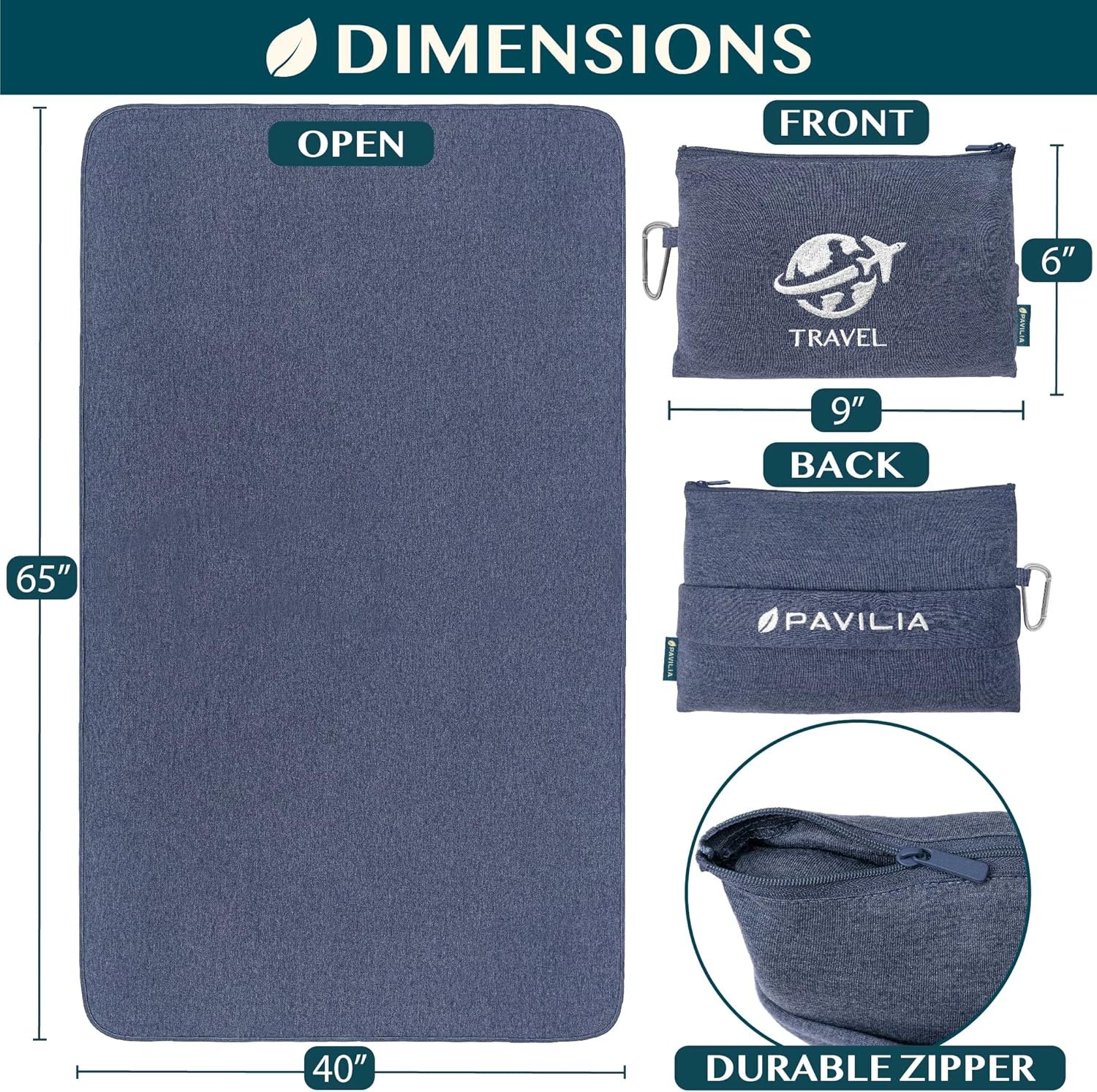PAVILIA Travel Blanket Compact, Airplane Packable Bag, Soft Fleece Portable Throw Pillow Combo Set, Plane Flight Car Trips Essentials Gift Accessories, Luggage Backpack Clip, Navy Blue, 65 x 40 inch