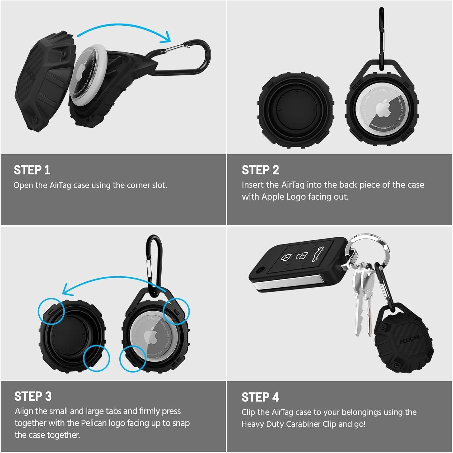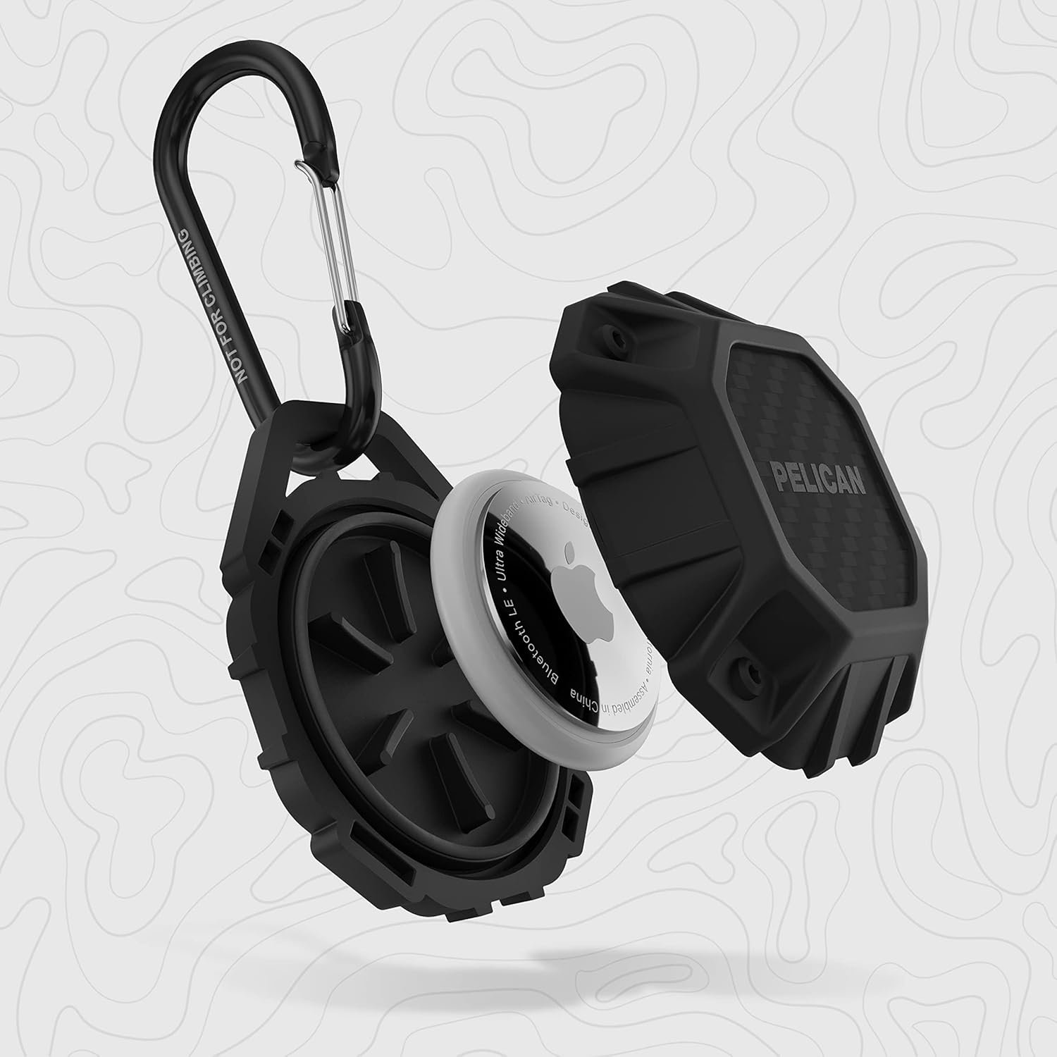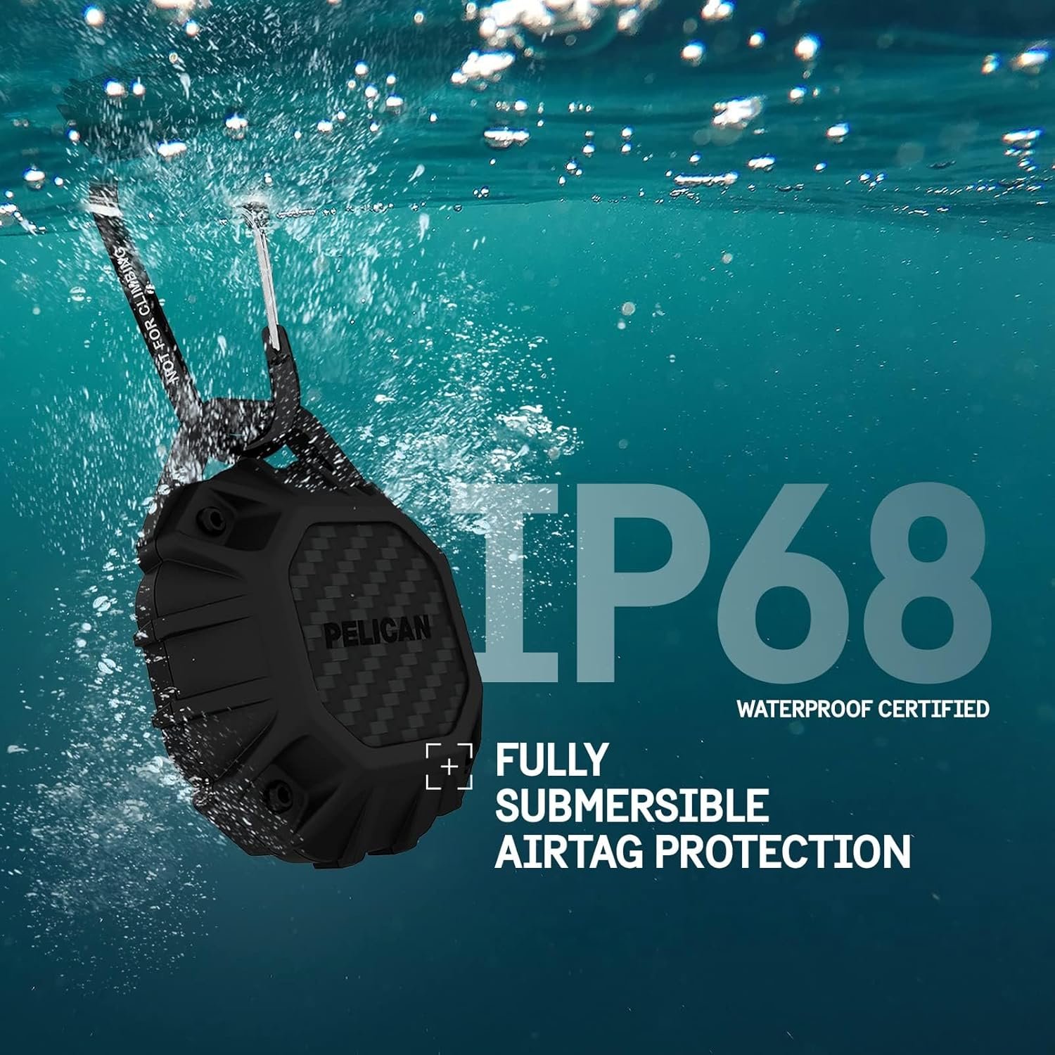 Package Contents: 1 Unit of Pelican Waterproof AirTag Case / Holder with Carabiner Clip – Marine Series Black (fits Apple AirTags only); One Year Limited Warranty; (Apple AirTag not included)
