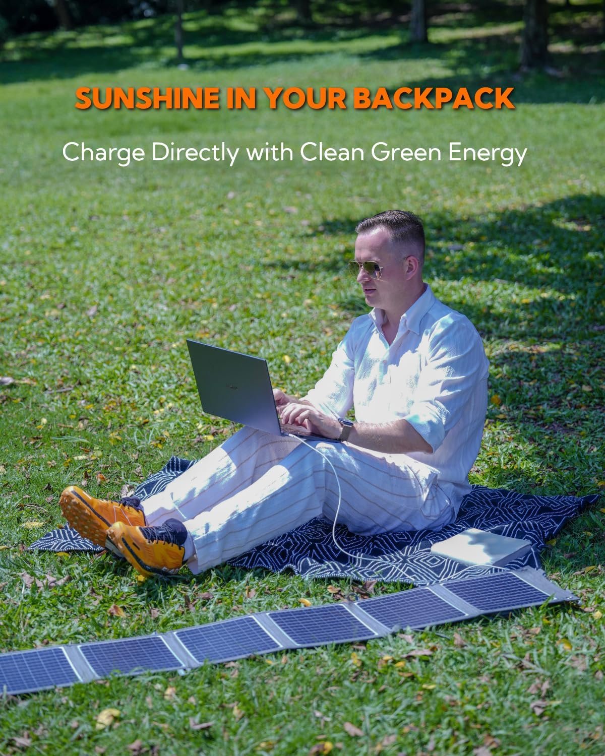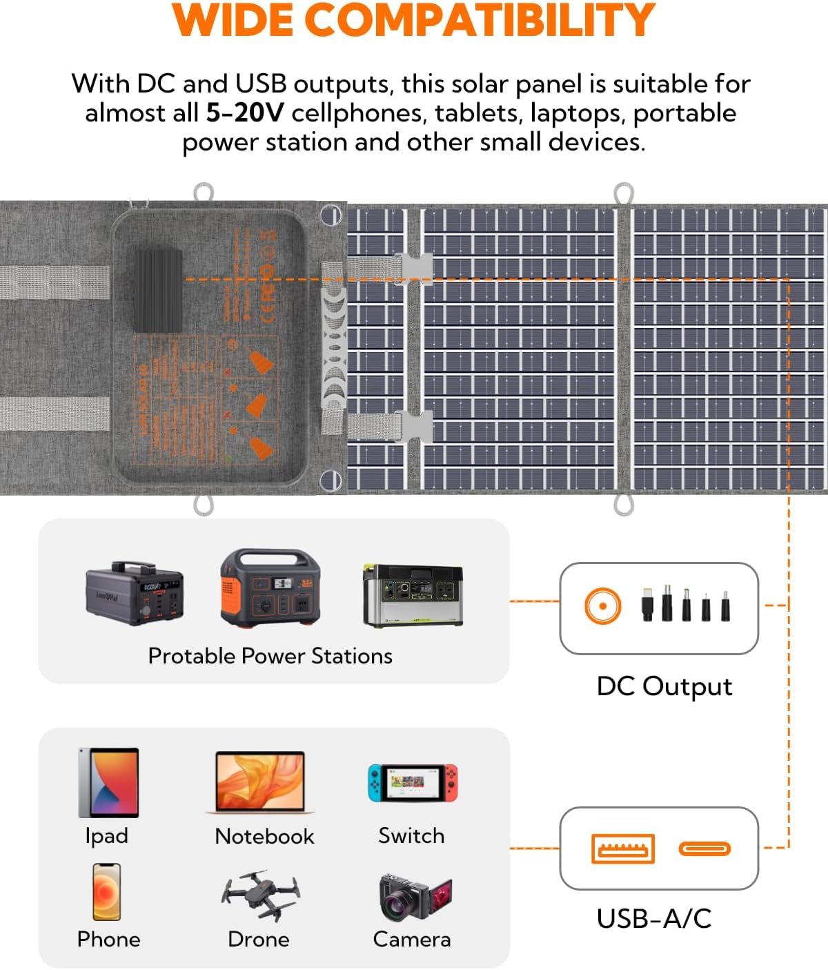 Wide Compatibility – With PD USB-C and USB-A ports, this folding solar panel backpacking is compatible with laptops, smartphones (both Android and Apple), tablets, cameras, drone chargers, and more. Additionally, its DC port and five included adapter heads ensure compatibility with most portable power stations on the market. Equipped with an intelligent chip, the solar panel identifies charging devices and delivers optimal charging speeds.