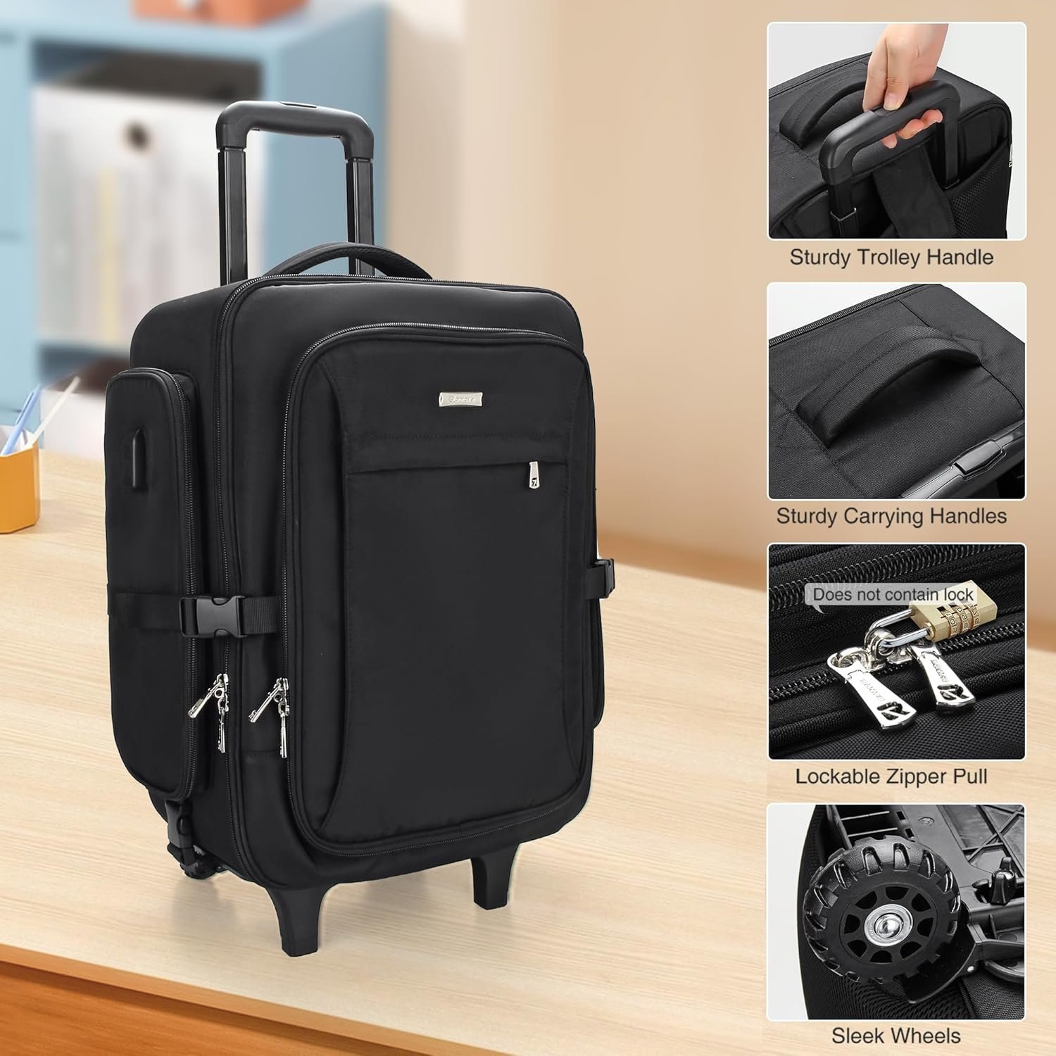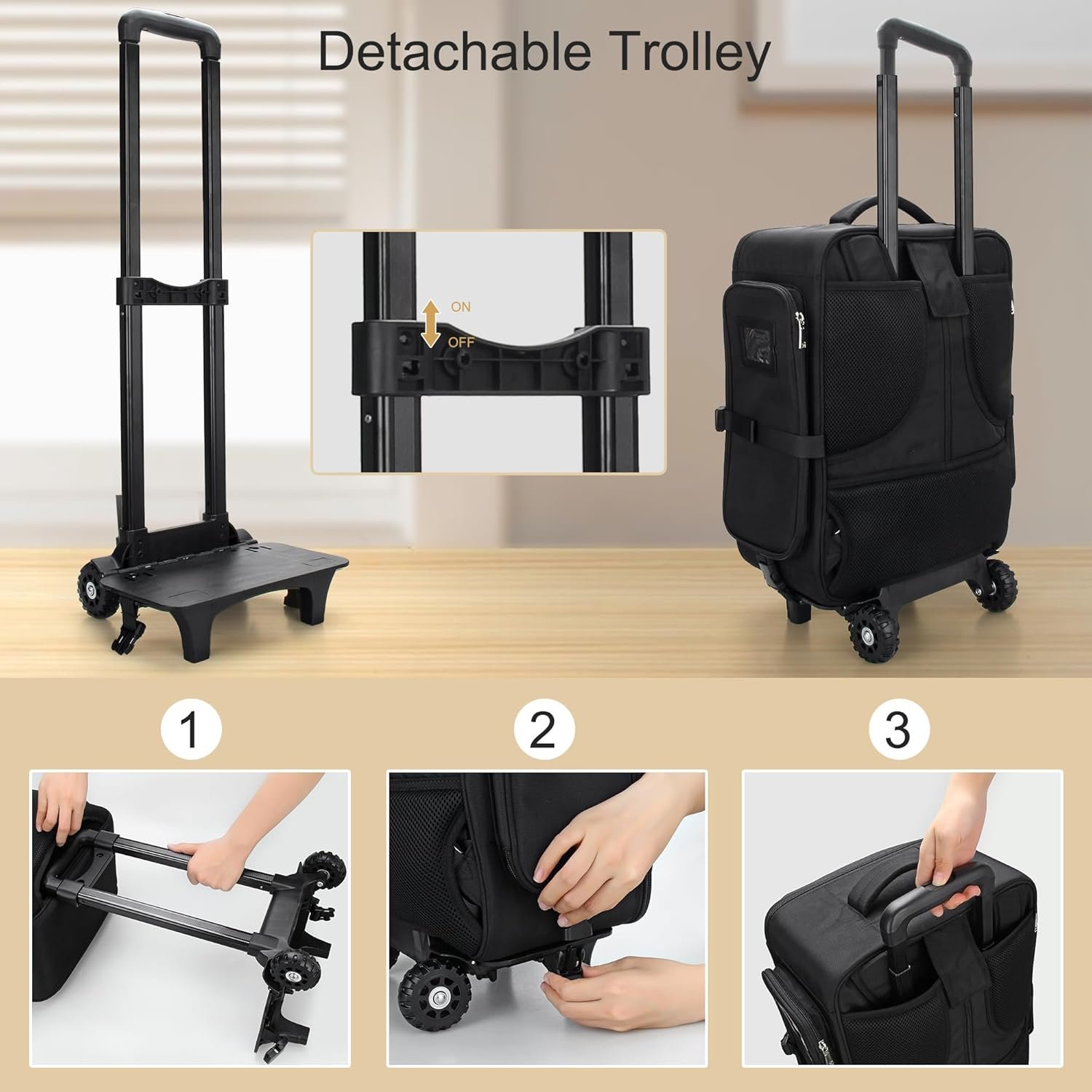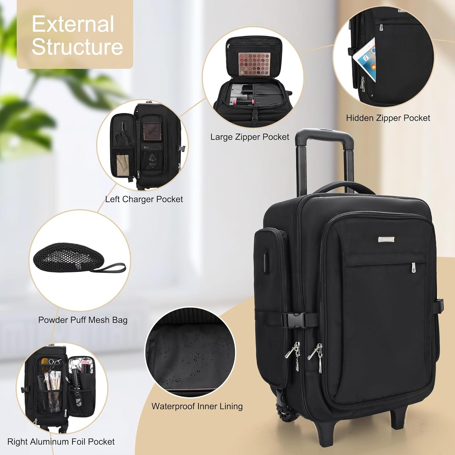 【Unique Features with the Makeup Organizer】Hideaway shoulder straps, not dragging while the backpack is rolling. Built-in USB charger port outside and charging cable inside. An insulation pocket of the backpack, great for storing curling irons and straighteners. Comes with a powder puff mesh bag. Business card holder on the side.