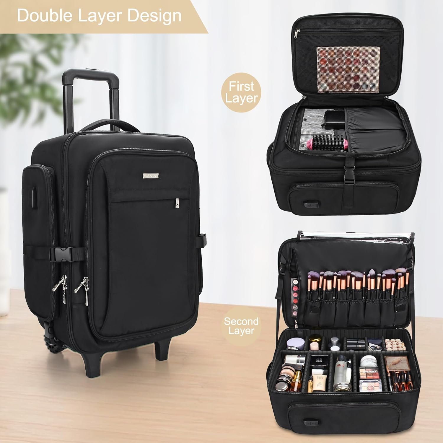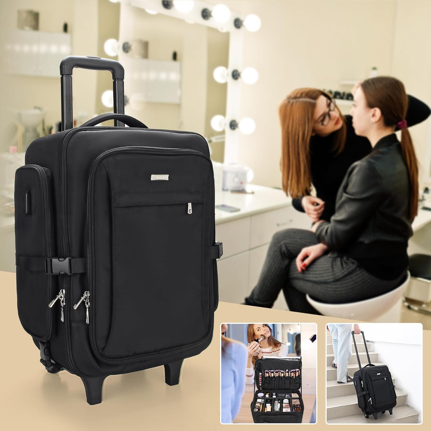 【Muiti-Compartments & Large Capacity Trolley】The rolling makeup case with extra large capacity, which can meet the storage needs of a professional makeup artist. With 2 layer design, professional makeup brush slots, an insulated side pocket for curling iron, and several zippered pockets.