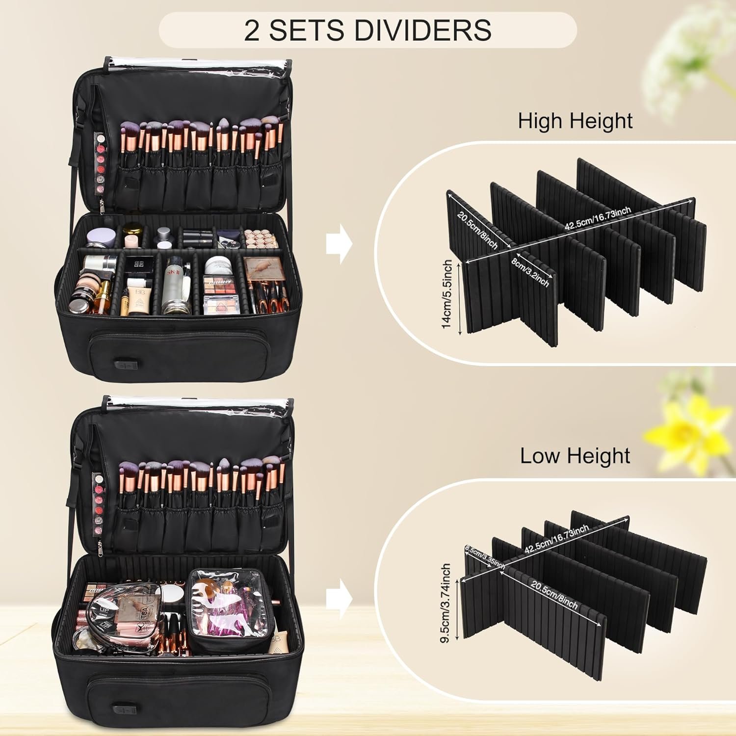 【Two Sets of Adjustable Dividers Cosmetic Case】The rolling makeup backpack comes with two sets of different height-adjustable dividers. It can be flexible with use. DIY your makeup case organizer with adjustable dividers.