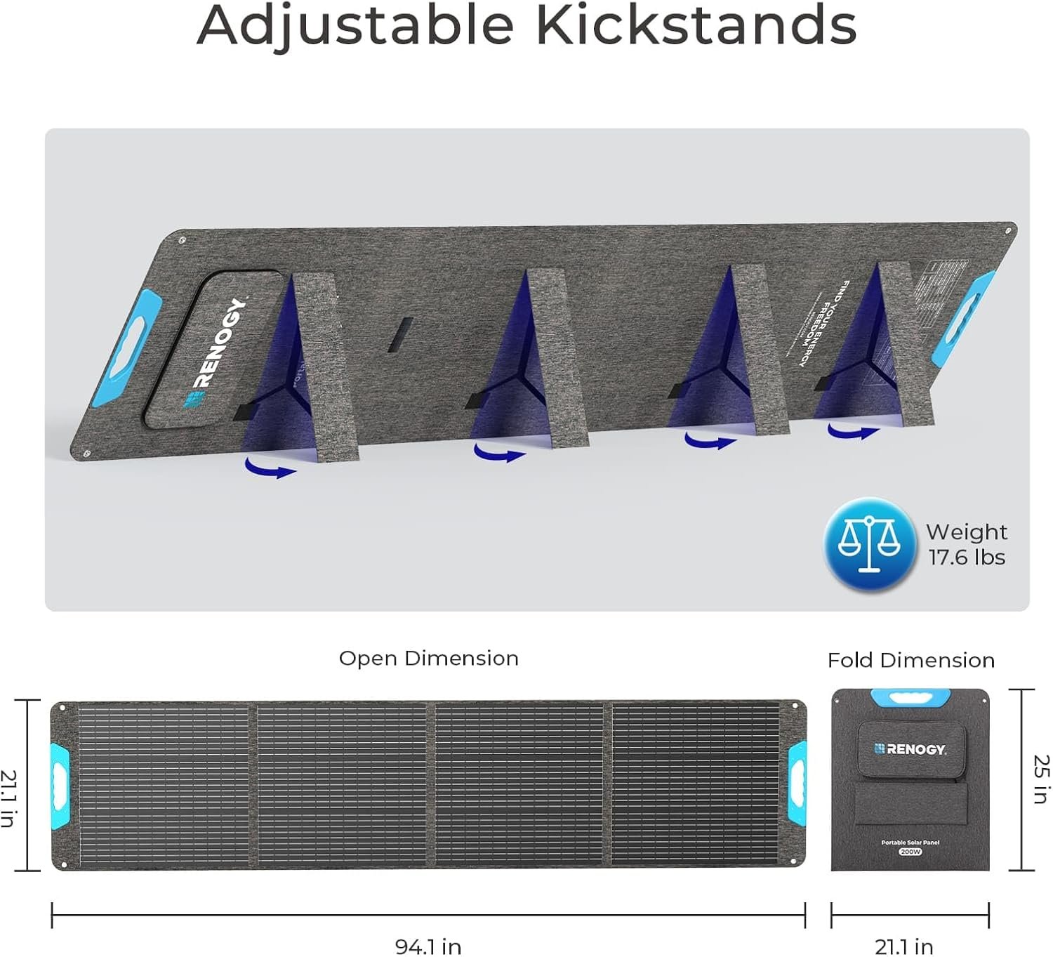 Renogy portable solar panels can be super lightweight to carry outside for camping, fishing, gardening, and any occasion you need itDesign for outdoor activity with 4 mounting holes, easy to tie on the car top, RV, or tree which offers you more flexibility for DIY installation optionsThe kickstands can help you capture more sunlightUnfold a world of on-the-go power & sustainable freedom, power up your efficiency with our portable power station