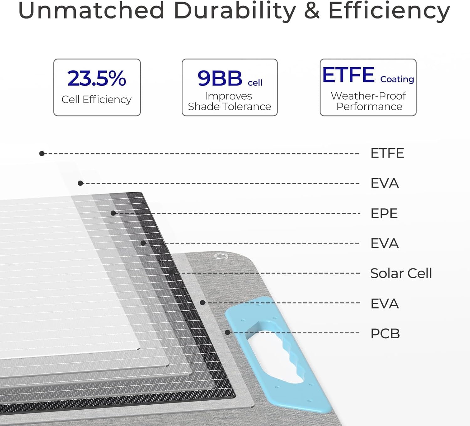 Portable and Easy to Install: Renogy portable solar panels can be super lightweight to carry outside for camping, fishing, gardening, and any occasion you need it. You will neither have the installation problem during usage nor have to consider how hard it is to install it on the roof.