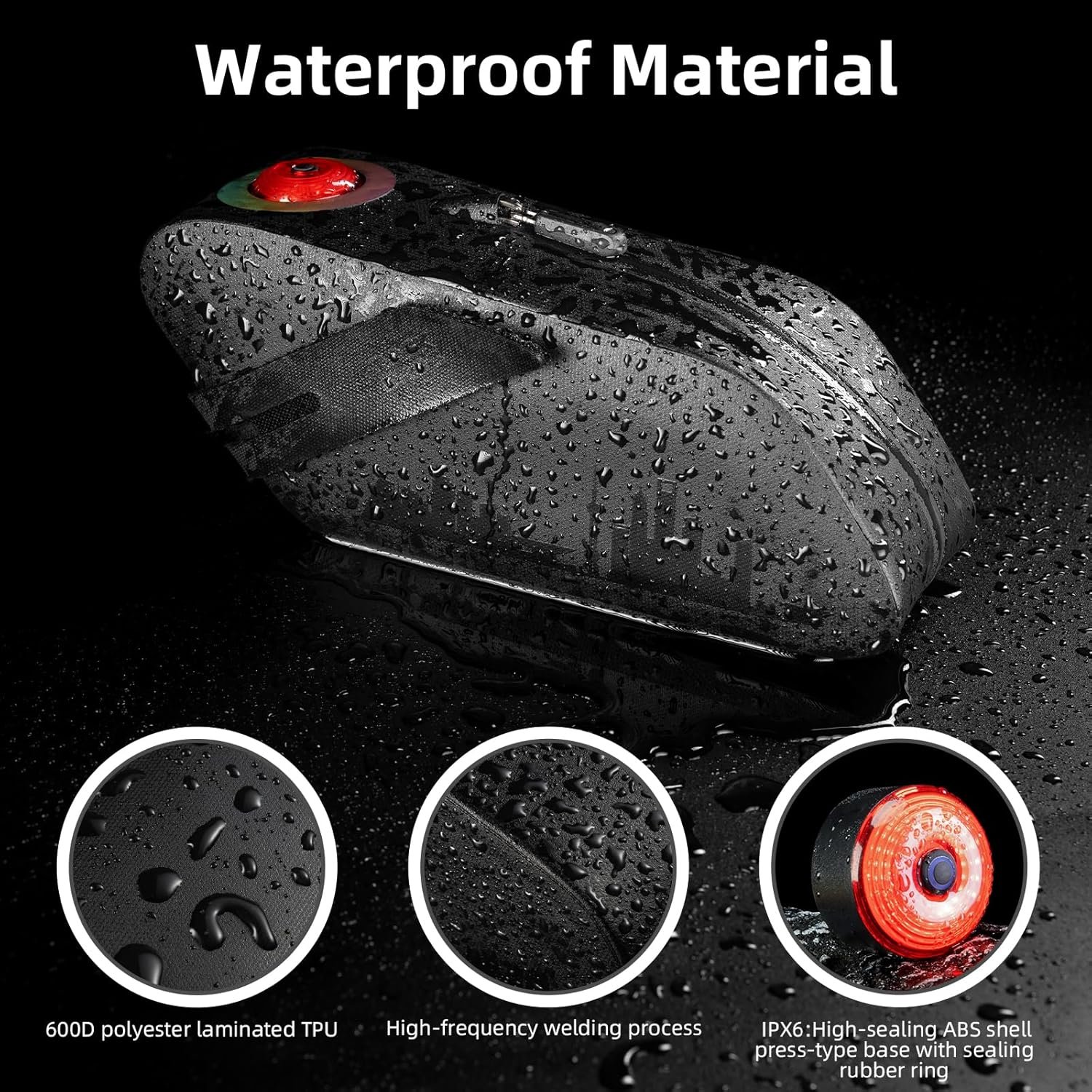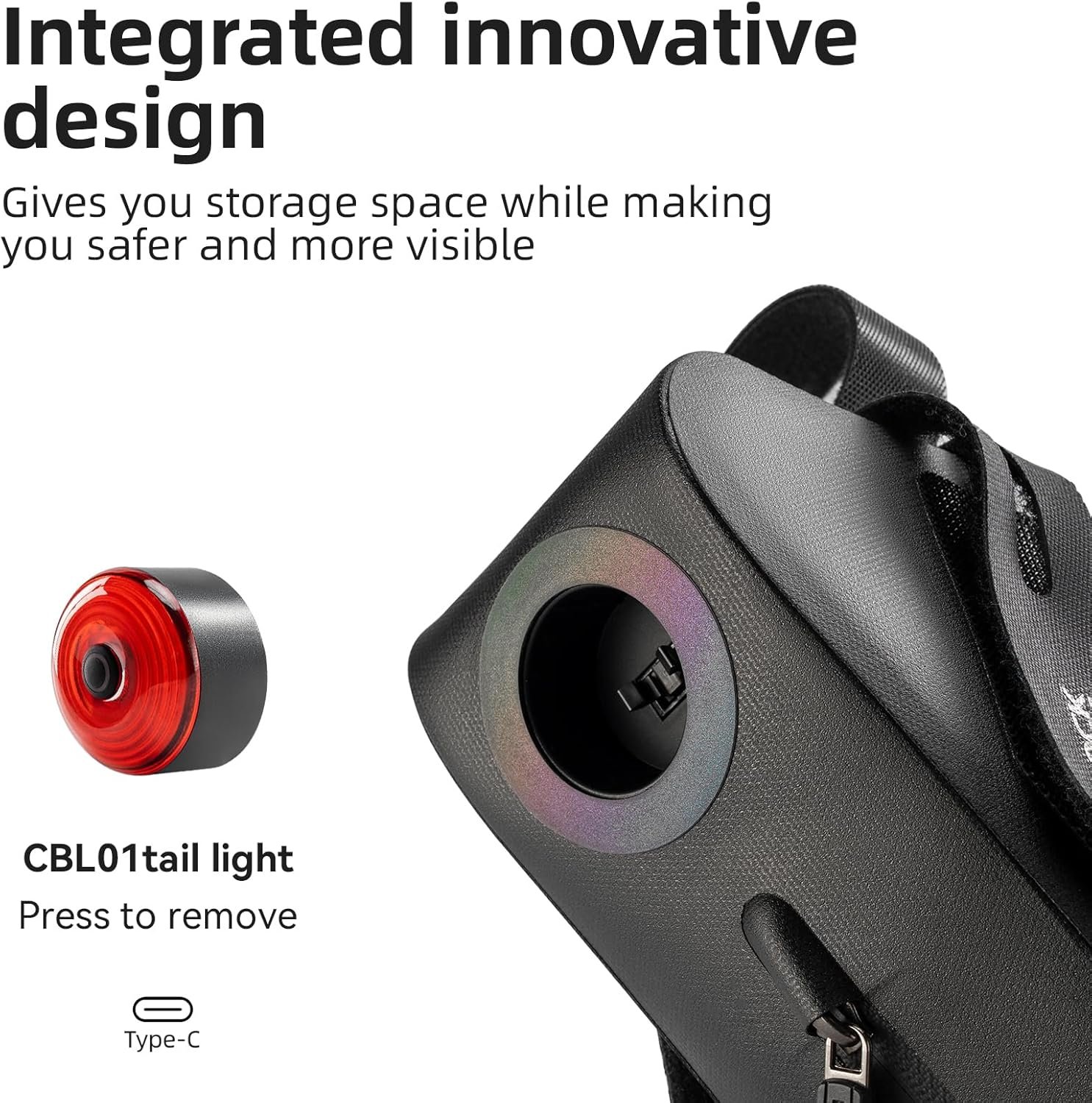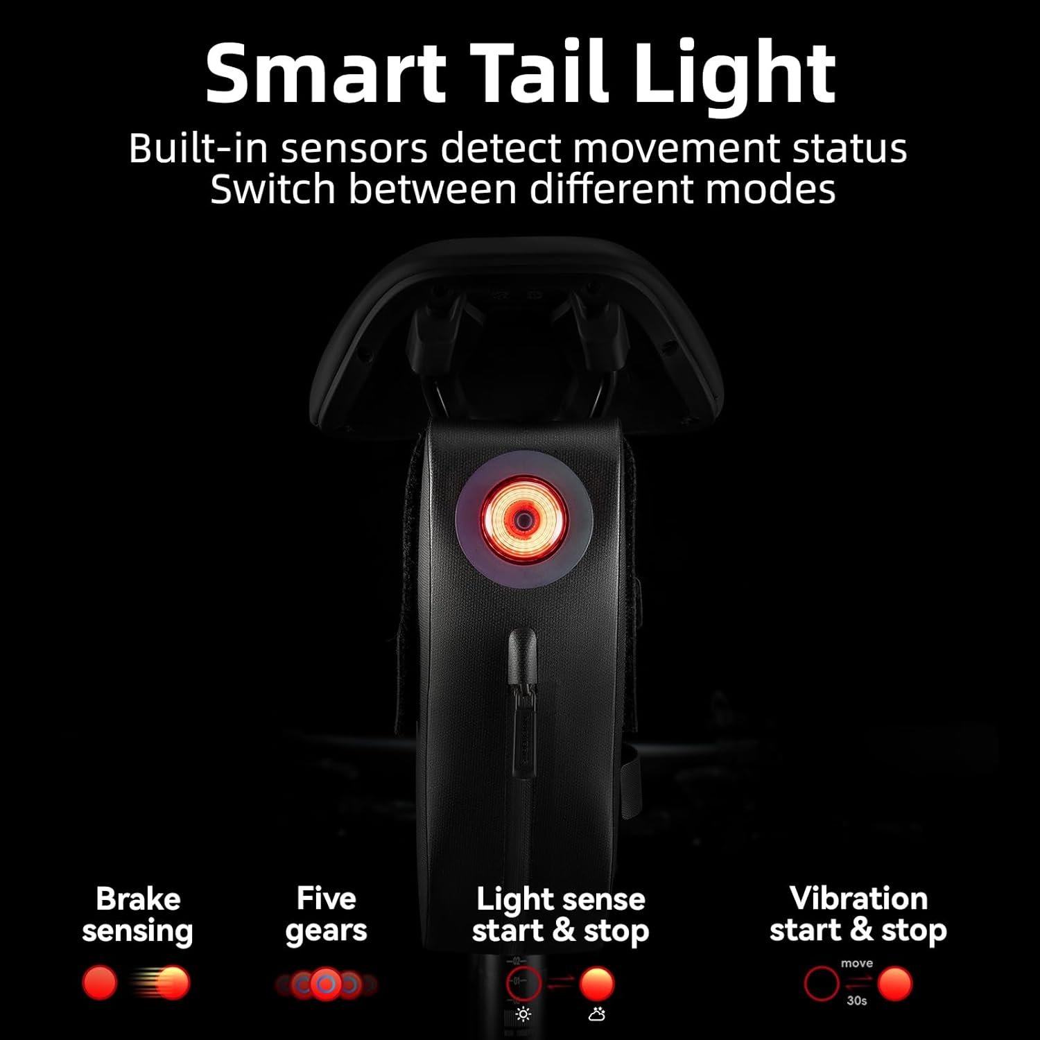 [Smart Embedded Tail Light]: Bicycle seat bag features an innovative built-in smart tail light with light-sensing and vibration start & stop. Automatically brightens when braking. Easy press-to-install design with colorful reflective ring for added visibility and nighttime safety.