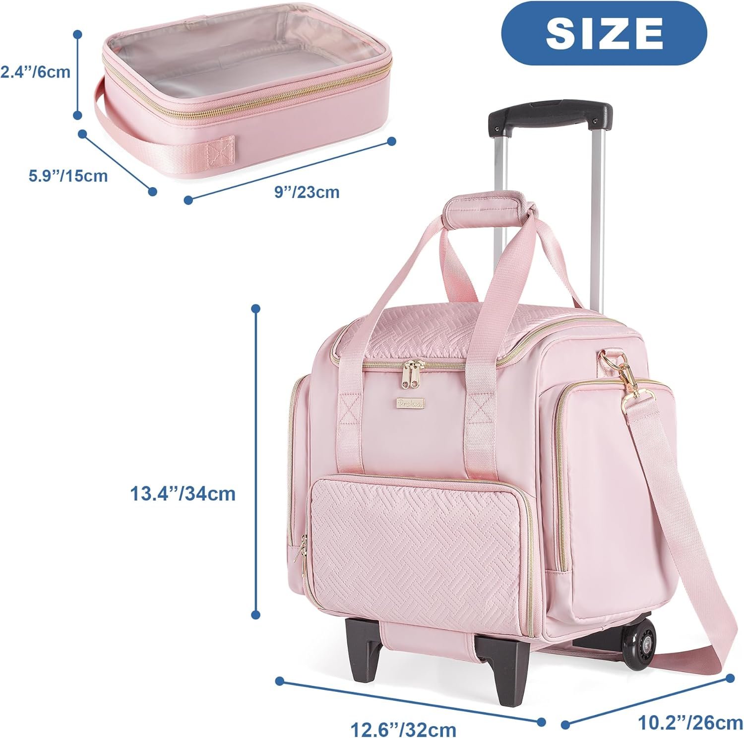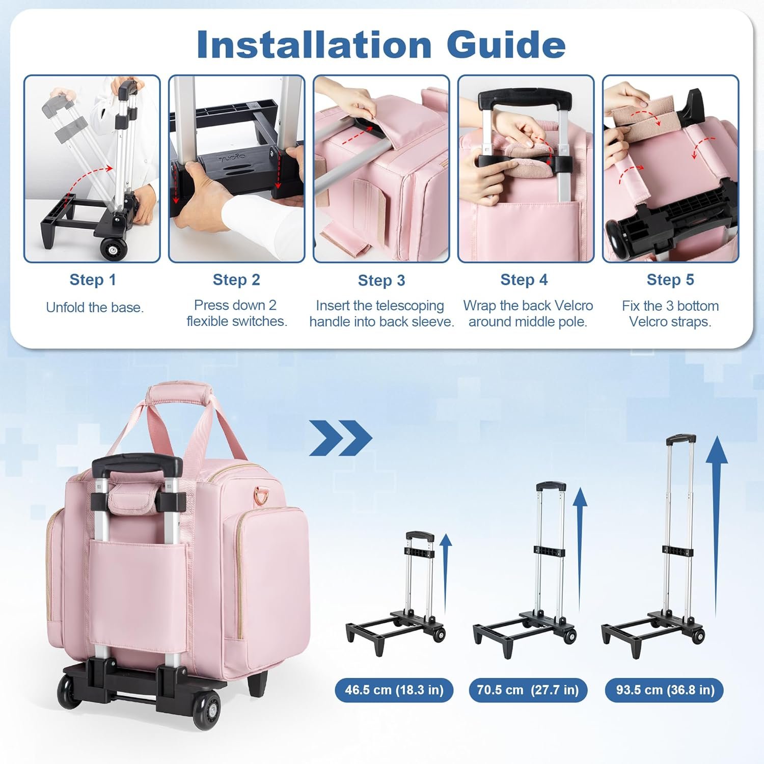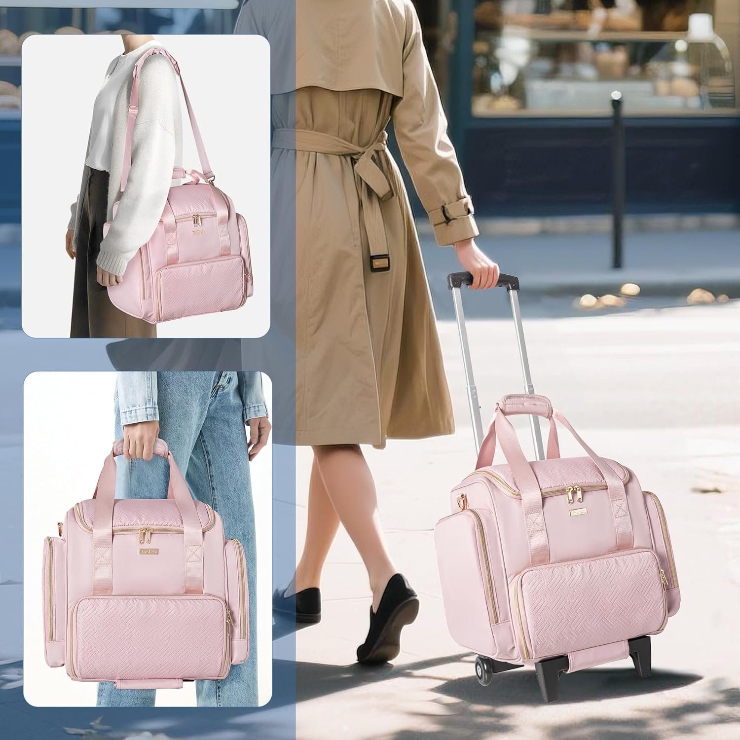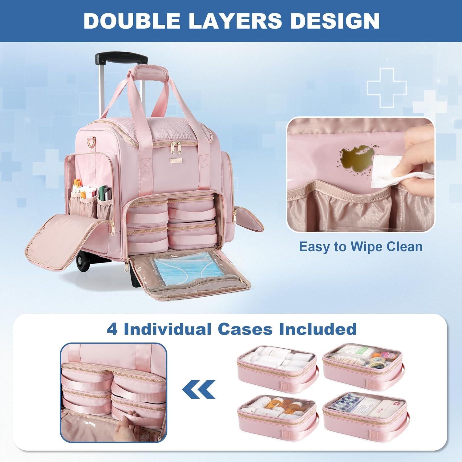 Rolling Medicine Bag for Travel, Large Pill Bottle Storage Bag on Wheels with 4 Cases and Detachable Trolley,Pink