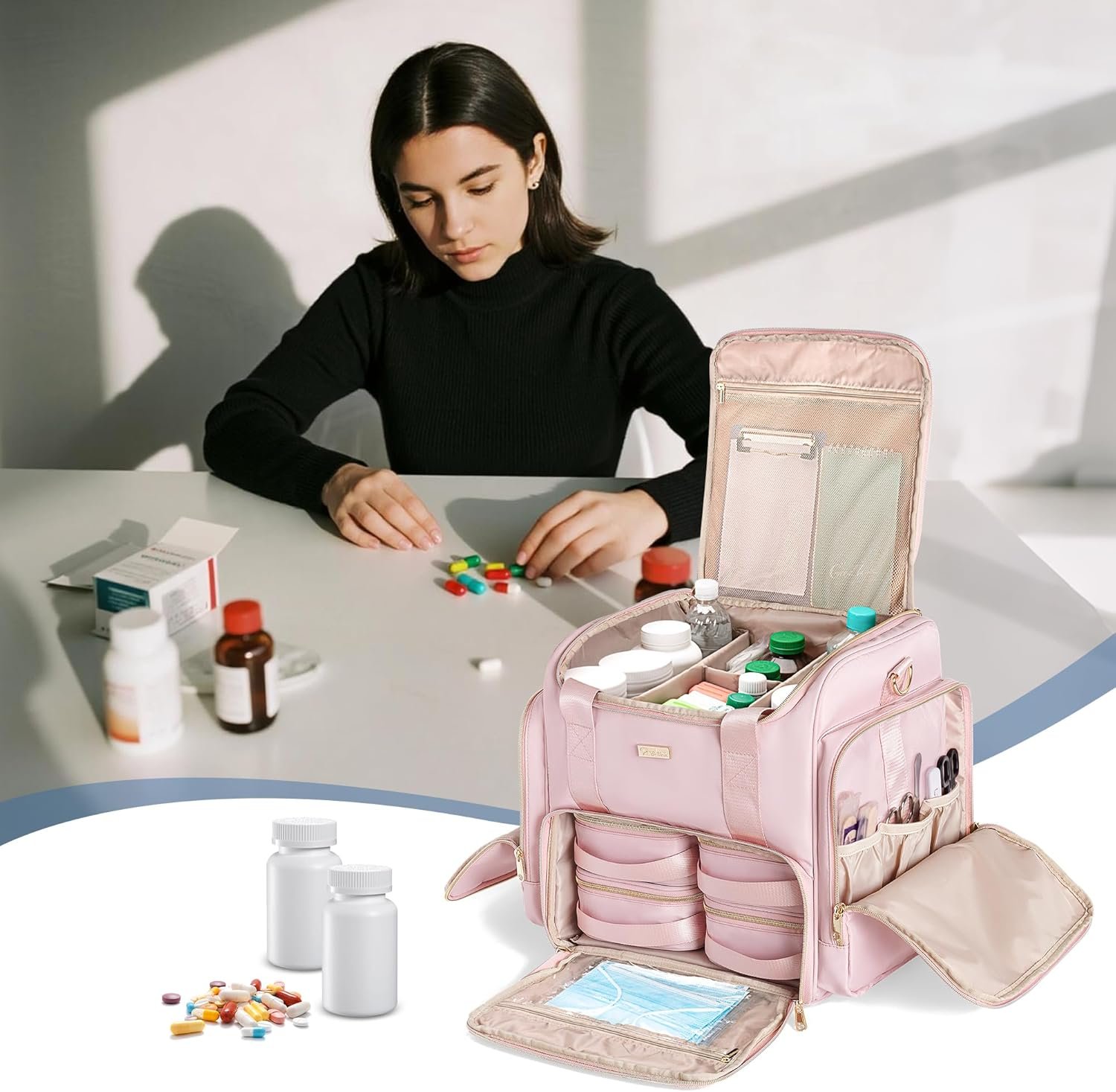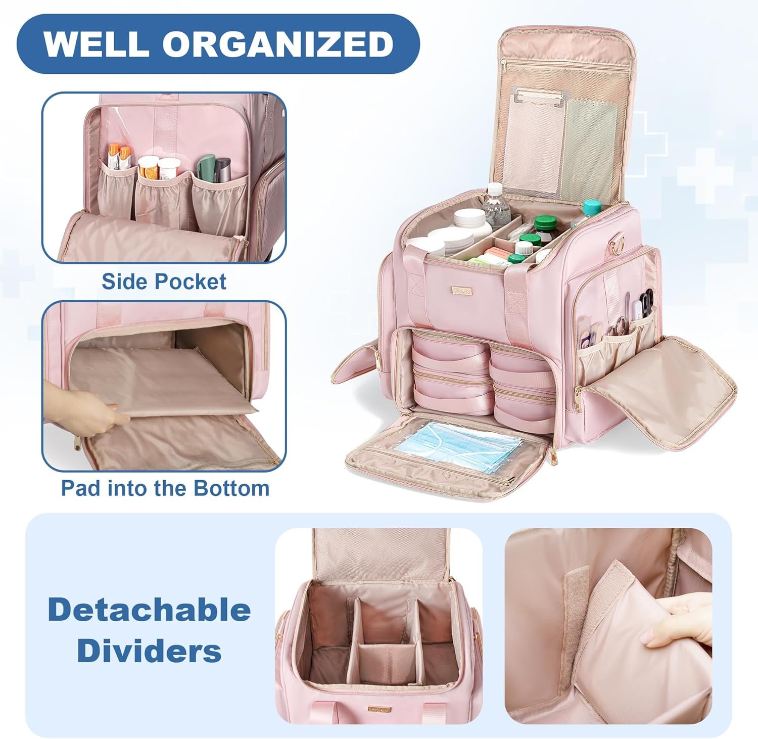 DOUBLE-LAYER DESIGN – The top compartment features removable dividers to customize the space into up to four sections, ideal for organizing large pill bottles, medical supplies, and equipment. (Empty bag only. Whole bag dimension: 12.6 x 10.2 x 13.4 inches)