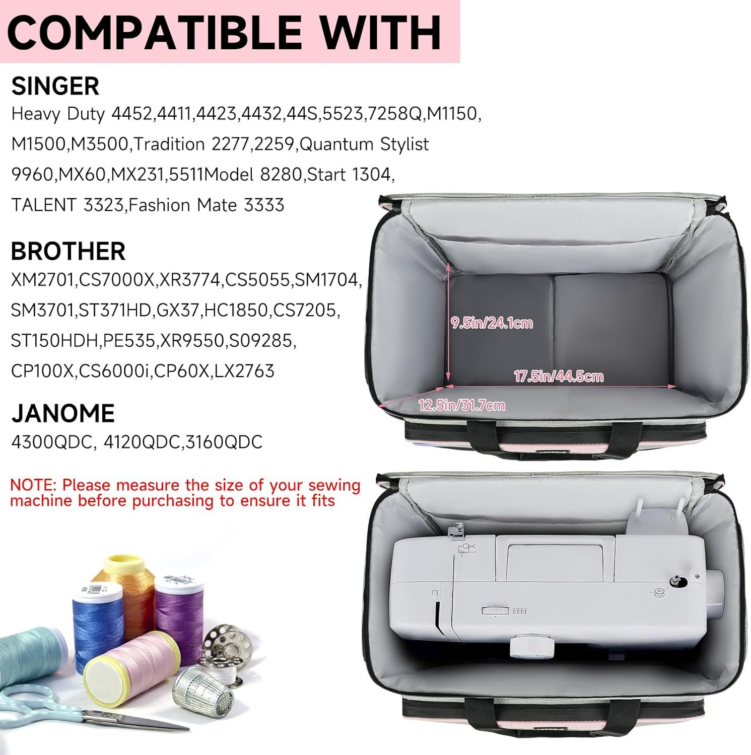 Compatibility: Main compartment size: 17.5×9.5×12.5inch(44.5 x 24.1 x 31.7 cm);The spacious main compartment fits most standard-sized sewing machines, compatible with Singer/Brother/Janome. Please measure your sewing machine size to ensure fit before purchasing (Bag Only!)