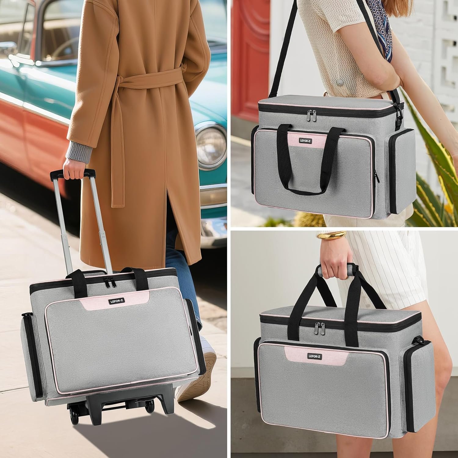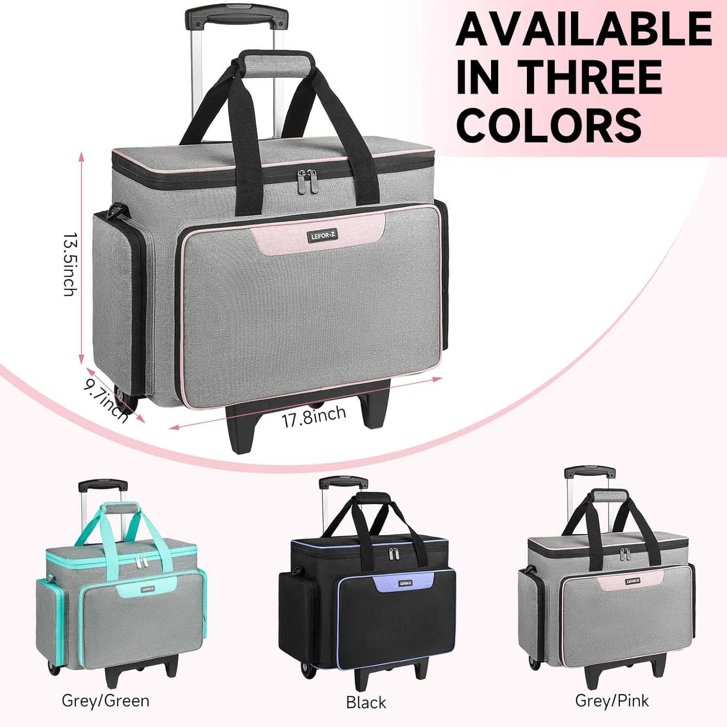 Rolling Sewing Machine Case with Wheels,Sewing Machine Carrying Bag,Trolley Tote Bag Fits for Most Standard Singer,Brother,Janome Sewing Machine and Accessories,Grey/Pink