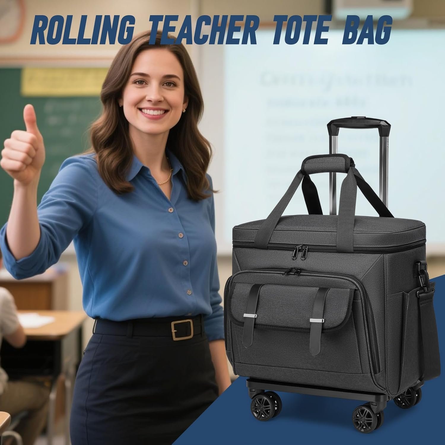 Rolling Teacher Tote Bag for Women Men,Large Tote Bag With Detachable Wheels Trolley,15.6 Inch Laptop Wheeled Teacher Bag for Work Office