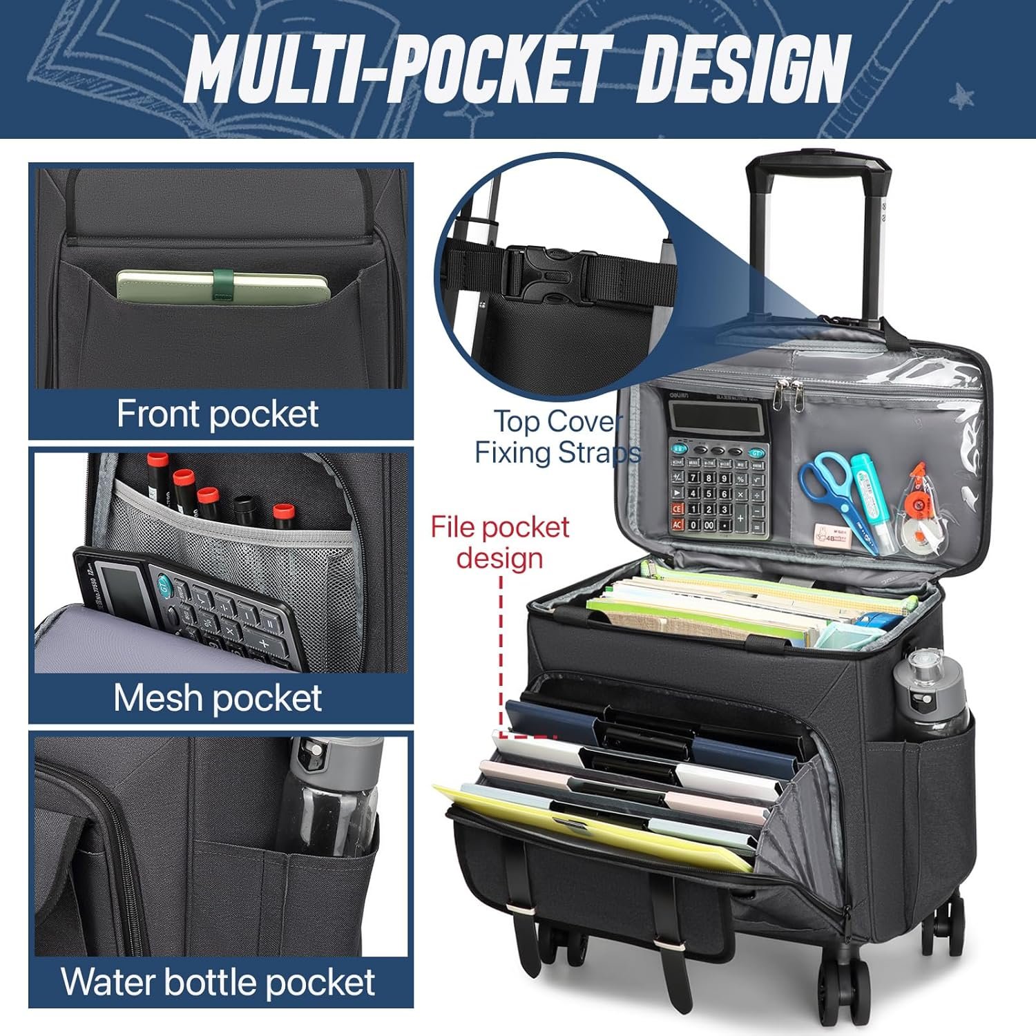 Extra-large space: The size of the rolling teacher bag is 15.5*12*8.5 inches. The maximum size of the foldable rolling pull rod is 37.7 inches. There is a main space with a base plate inside. There is a compartment for laptops and tablets. There are 2 zipper transparent bags and mesh bags on both sides. There is one mesh bag, a water cup bag and a magnetic portable pocket on the outside