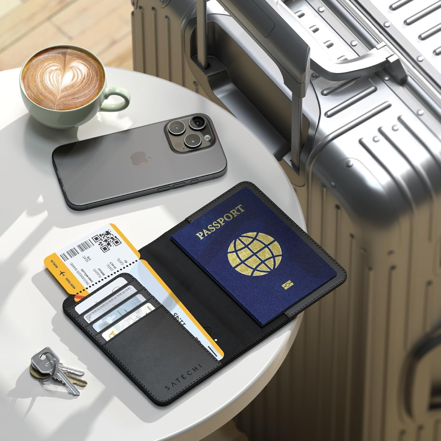 Satechi Passport Holder for Travel with Find My, Passport Cover with 4 Card Holder, Wireless Charging, and RFID protection – Travel Essential Vegan Leather Passport Holder – Black