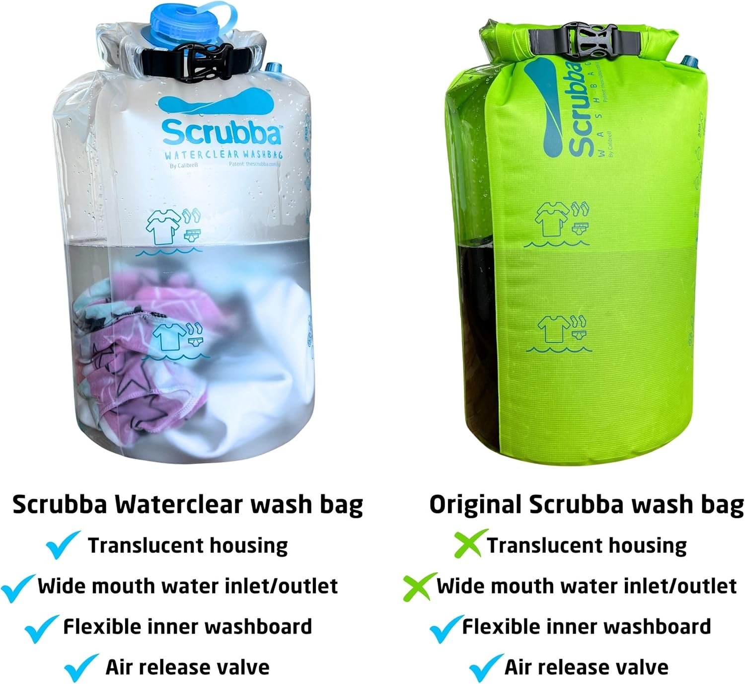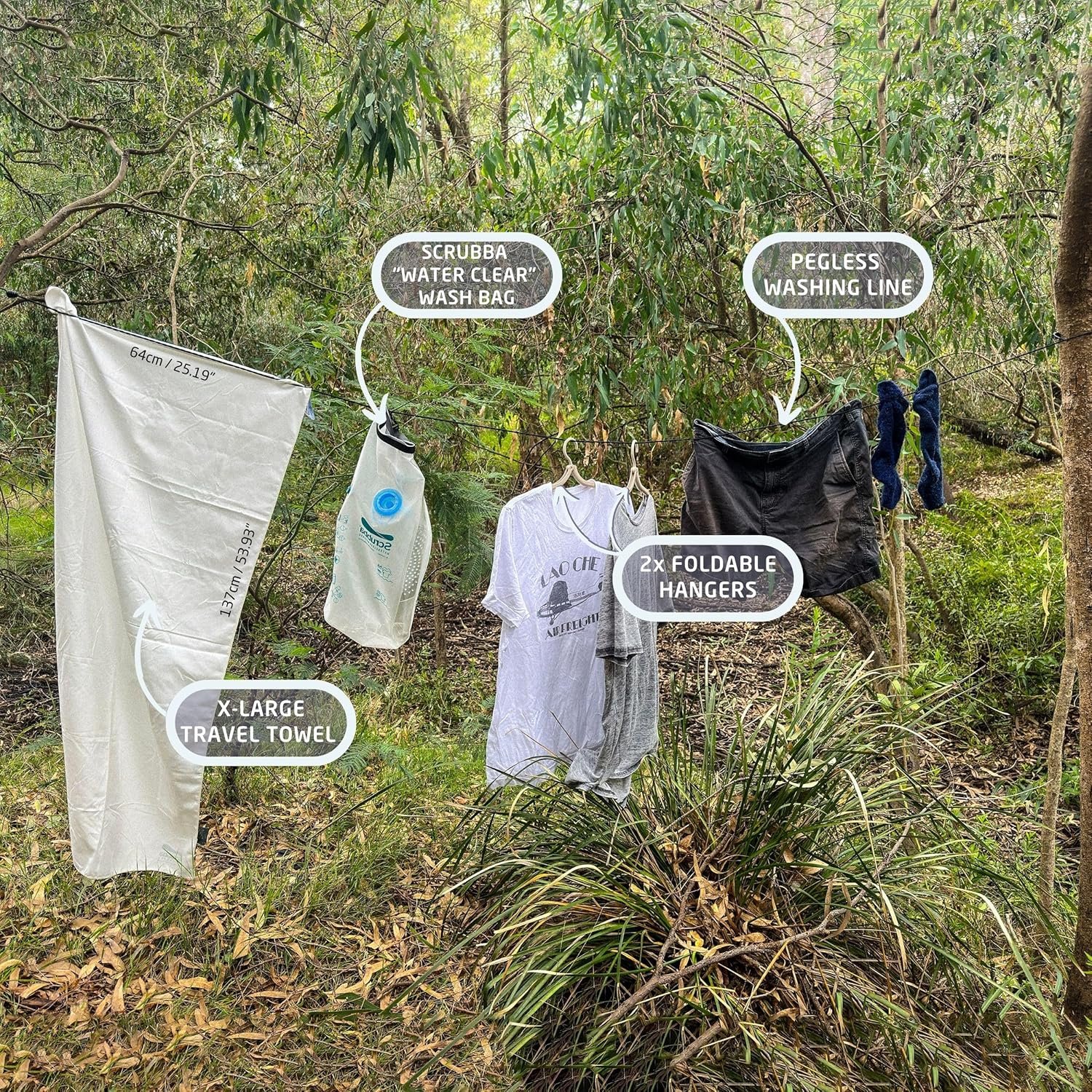 The Scrubba Waterclear Wash & Dry Kit is the ultimate portable laundry solution for travellers, backpackers, and adventurers who need fresh clothes anywhere. Designed for convenience, this kit includes the Scrubba Waterclear wash bag, an XL quick-dry towel, a pegless travel clothesline, and compact foldable hangers, providing everything you need for a complete wash-and-dry experience on the go. Whether you’re camping, staying in hotels, or on extended trips, this kit ensures clean, dry clothes with minimal effort. The Scrubba Waterclear wash bag features a translucent TPU housing, allowing you to see the cleaning process in real time. Simply add water, detergent, and clothes, then rub against the patented internal washboard to remove dirt effectively. The new wide-mouth water inlet/outlet makes rinsing faster and easier, reducing mess and saving time. Weighing just 195g (6.9 oz.), this ultra-light wash bag folds down to pocket size, making it perfect for carry-on luggage, backpacks, or glove compartments. Save money on expensive laundromats and hotel laundry services. The Scrubba Waterclear wash bag lets you wash up to two shirts, two pairs of socks, and two pairs of underwear per load, giving you fresh clothes without the hassle of finding a washing machine. No electricity required, just your hands and a few minutes of effort. More hygienic than hotel sinks, this bag lets you wash your clothes anytime, anywhere. Dry your clothes quickly with the XL quick-dry towel, designed to remove excess water before hanging. The pegless clothesline securely holds clothes without the need for pegs, stretching from 1.5m to 3m for flexibility. The foldable coat hangers keep shirts and garments in shape, ensuring faster drying and wrinkle-free results. Trusted by over 400,000 travellers, hikers, and campers, the Scrubba Waterclear Wash & Dry Kit is an eco-friendly alternative to traditional washing, using less water while delivering a machine-quality clean. Backed by our 2-year manufacturer warranty, so you can buy with confidence. Wherever your journey takes you, stay fresh and travel light with Scrubba.