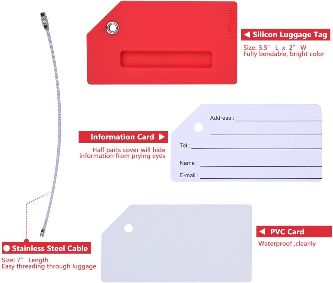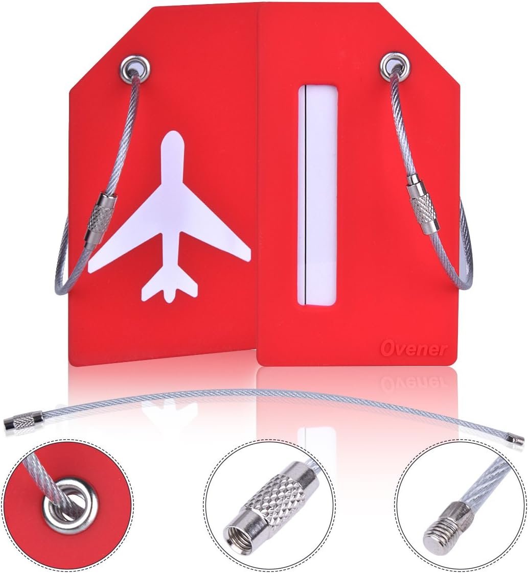 Silicone Luggage Tag With Name ID Card Perfect to Quickly Spot Luggage Suitcase By Ovener Using a luggage tag to help identify your luggage does not mean it has to be boring. Ovener has a new line of long rubber luggage tags that are fun, easy to spot, and helps put a little personality to your own travel experience. Simply write your information directly onto the card using a ball point pen. Our half part cover will completely hide your information from prying eyes. Features Color: Red, Black,Blue,Green,Orange,Gray, Purple Style: Plane’s design 2Pack, Material: Flexible Silicon. Dimension: Tags size: L3.5 x W2 inch, Name card size: L 3.4x W1.7inch . You can write your NAME and ADDRESS on the name card, for easy to identify your luggage from others. Made of quality Silicone ability to bend without breaking, small size and light weight, convenient to carry. Come with a string and a screw connector for closely connecting your luggage. Bright colours help you to pick out your luggage at your first sight, so don’t worry about take the luggage by mistake. Durability and Strong – Makes Traveling Easier, Safer and Secure. Package Including: Each tag include: Silicon luggage tags case + stainless steel string + blank paper + PVC cover front of paper .