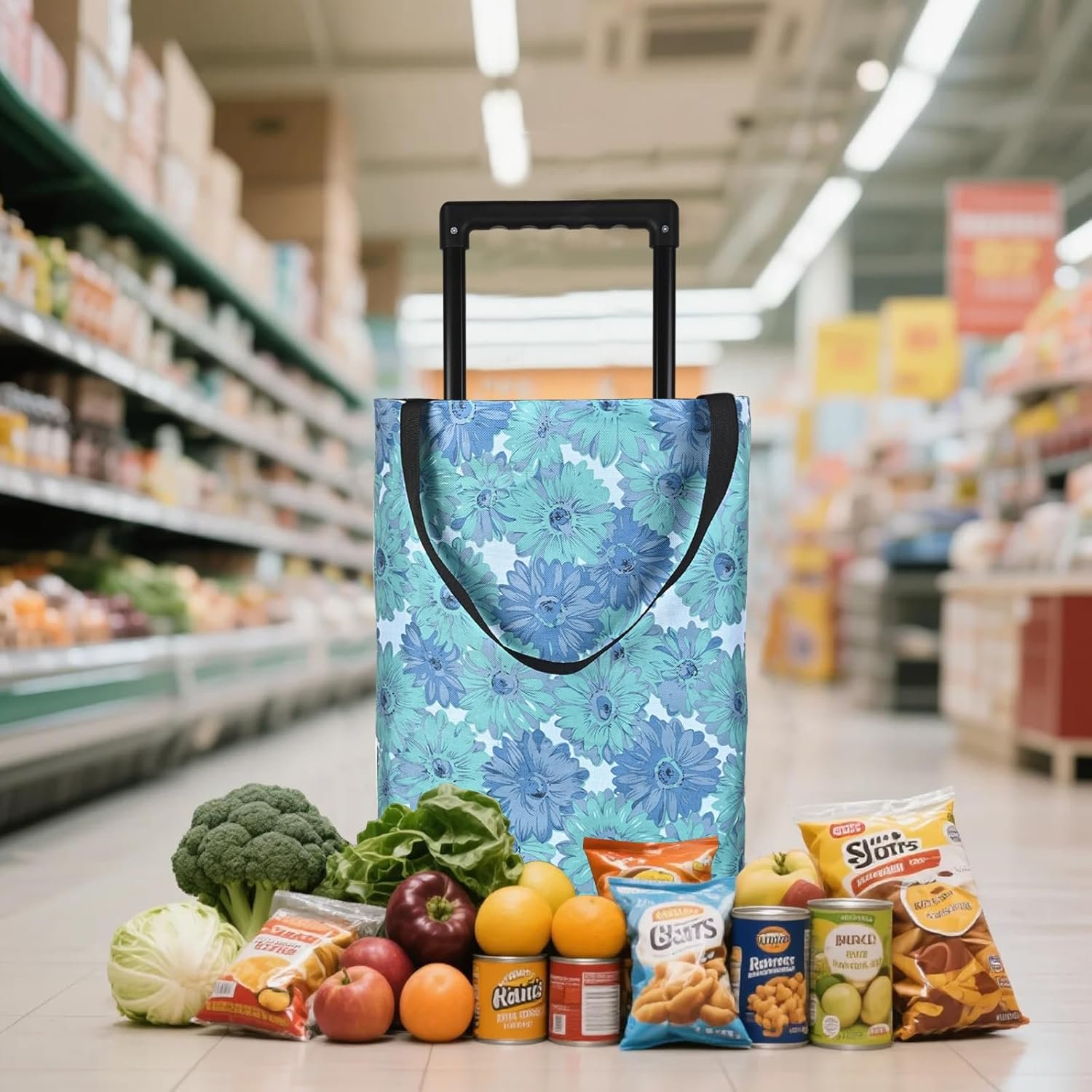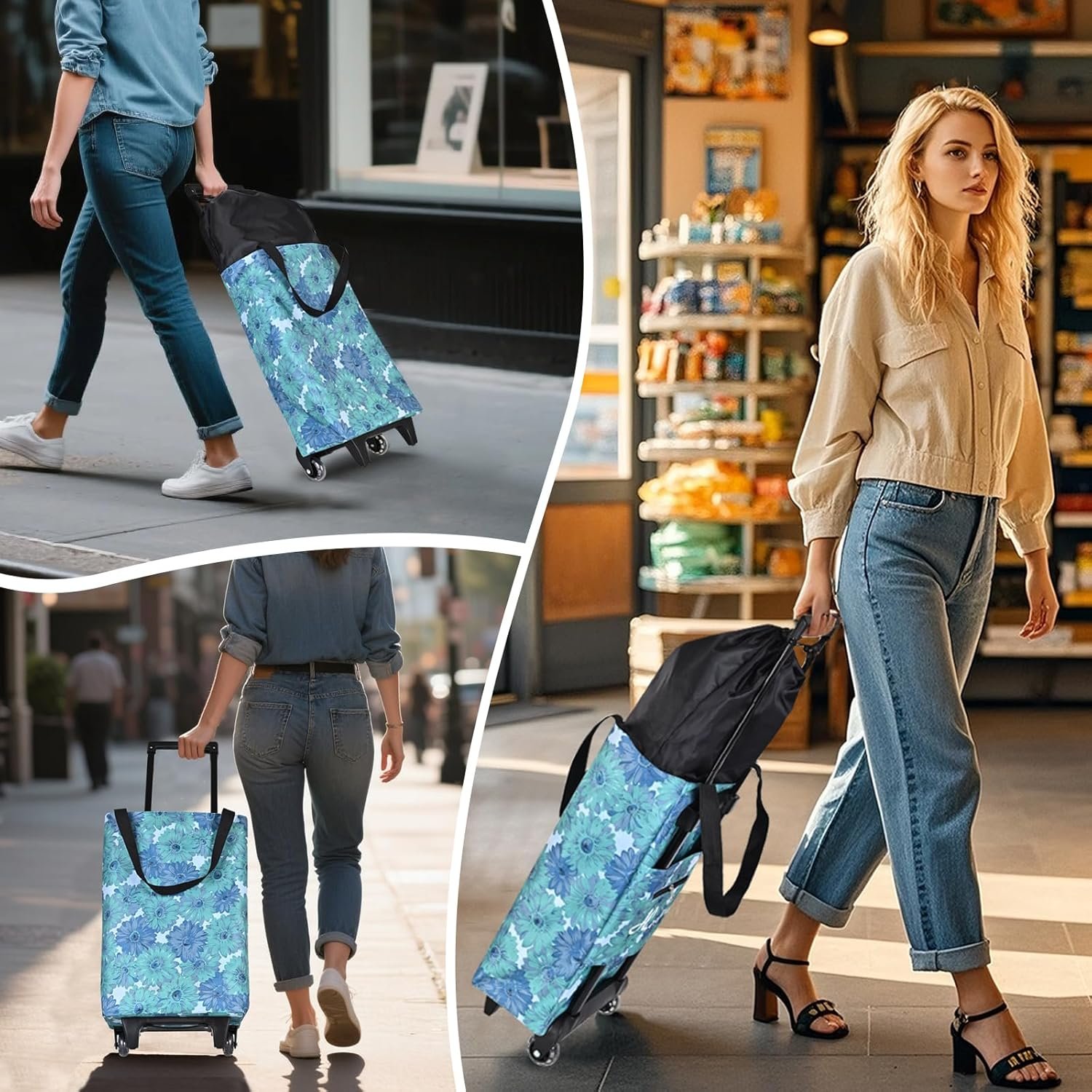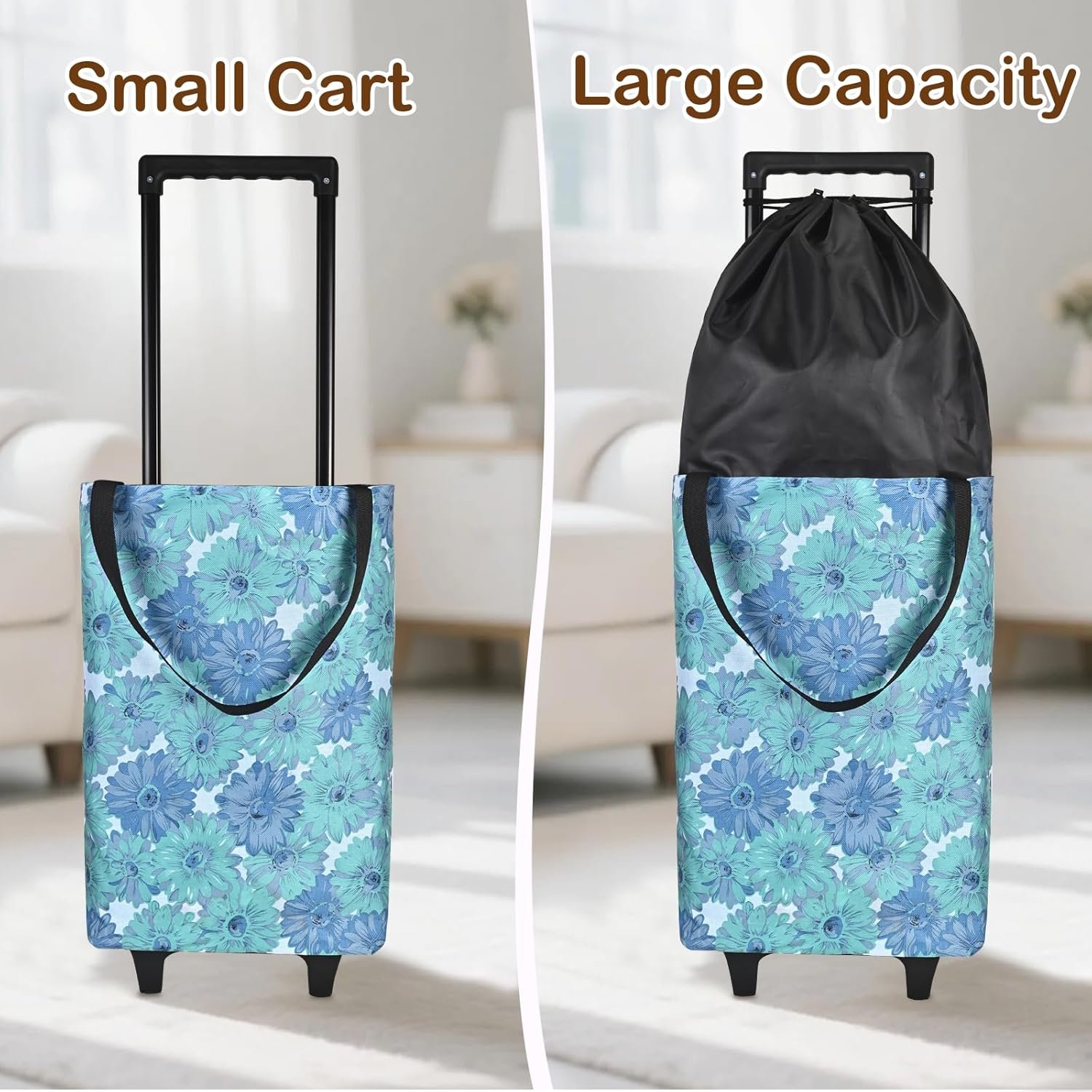 Small Collapsible Shopping Cart,Shopping Cart with Wheels,Folding Portable Bag,Waterproof Rolling Bag,Trolley Tote Stair Climbing for Traveling,Gift for Women,Older (Flower,Expandable Bag)