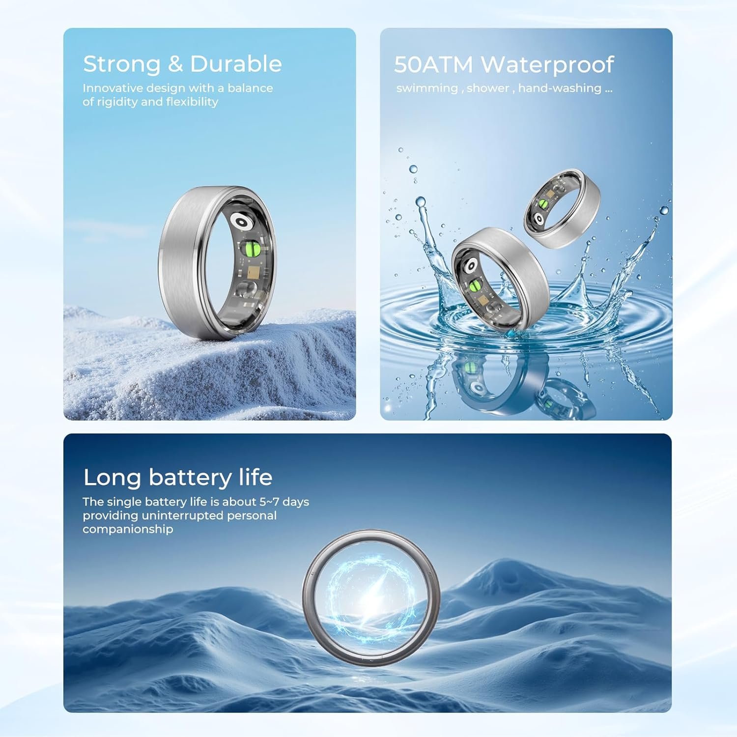 【5ATM Waterproof & Durable】This smart ring health tracker is waterproof beyond 50 meters, suitable for diving. You can check the time anytime without removing it when washing hands or showering. It also enables you to wear it during shallow water swimming to record exercise data