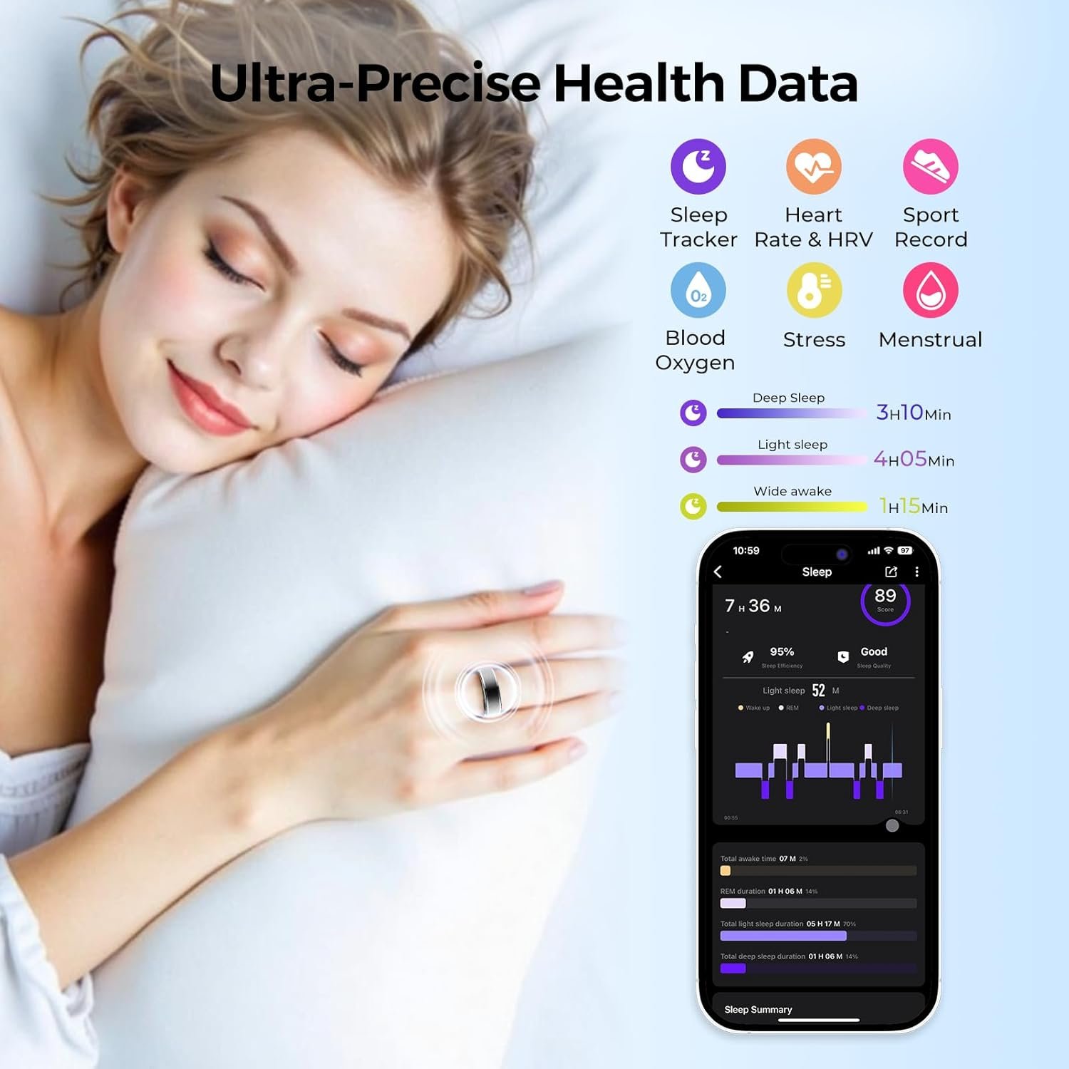 【Multifunctional Smart Ring】The vital health ring combines health monitoring, fitness tracking, and sleep analysis. Track heart rate, blood oxygen(SpO₂), stress, HRV, sleep data, steps, distance and calories. This lightweight fitness ring provides real-time data to help you meet your health goals