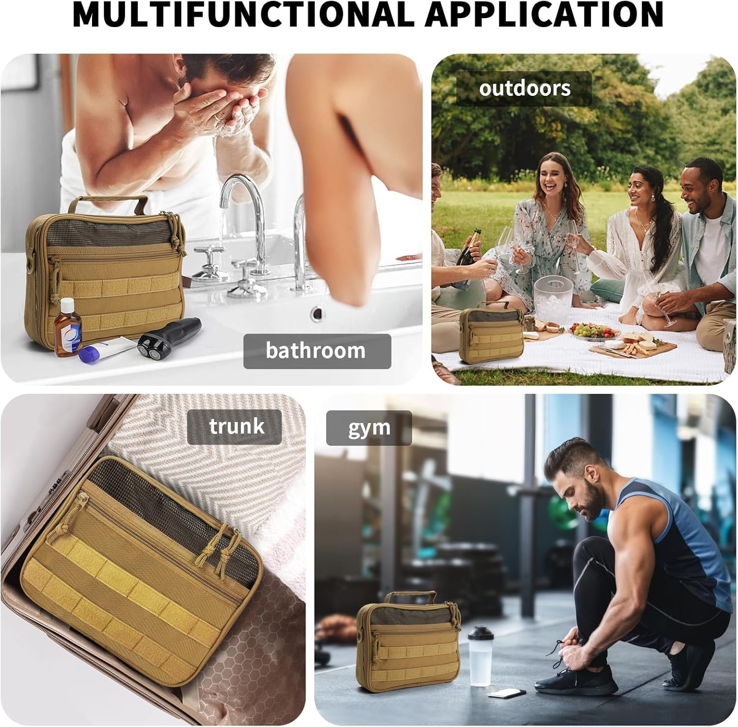 Multi-Functional Hanging Toiletry Bag for Men – Built-In 360° Rotating Hook for Bathroom/Campsite Use + Front MOLLE Panel Compatible with Carabiners & Accessories, Back Zipper Pocket Secures Valuables.