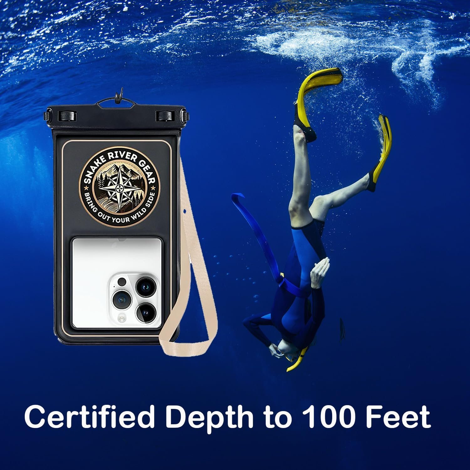 Snake River Gear – Bring Out Your Wild Side – Special Edition – Adventure Grade Cell Phone Waterproof Floating Armor Case with touch window for pictures and video certified depth to 100 feet – Black with detachable tan lanyard for kayak, beach, pool, or cruise ship essentials – Fits all iPhone models including Pro Max and all cell phones up to 6.9 inches – Black with detachable tan lanyard for neck, wrist, fishing vest, or dive vest. Essential pool and Cruise Ship adventure gear.