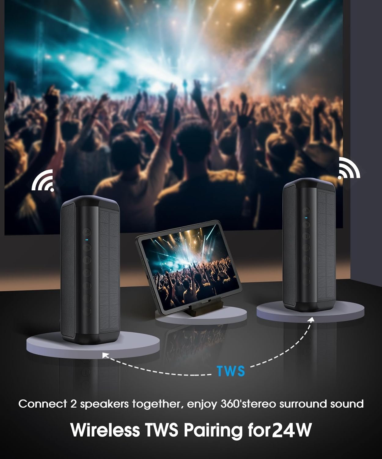 【TWS Pairing Function】: Wirelessly pair any two Bluetooth speakers (Note: If TWS pairing is required, please purchase two Bluetooth speakers) to play left and right stereo music separately. Play music in dual stereo in two different areas (Note: no more than 100 feet apart), when playing a non-Bluetooth device, you can use a 3.5mm audio cable to connect your device or TV to the speaker Aux-In jack. Connect the two speakers together to create immersive stereo surround sound that fills any room with powerful surround sound. Perfect for gaming, music and movie playback