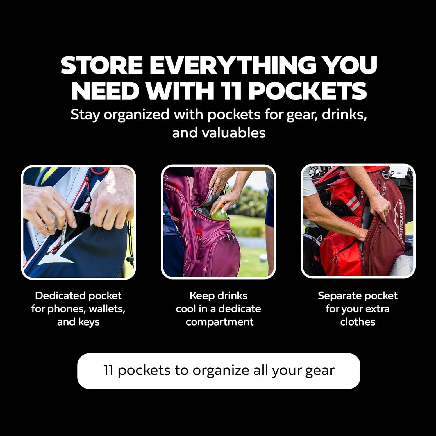 Strategic Pocket Layout: With 11 pockets, including a large apparel pocket, a velour-lined valuables pocket, and multiple accessory pockets, you’ll have ample space to store all your gear, from extra balls and tees to personal items and snacks.