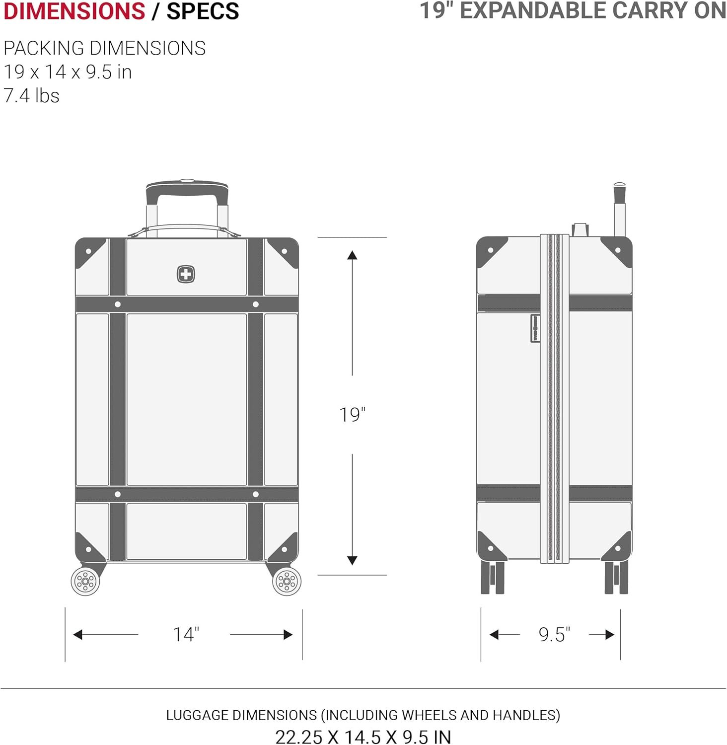 DIMENSIONS: 19” Expandable Trunk Carry On Spinner Luggage (7.4 lbs, Packing Dimensions: 19” x 14” x 9.5”, Product Dimensions: 22.25” x 14.5” x 9.5”), 26” Expandable Trunk Checked Spinner Luggage (10.9 lbs, Packing Dimensions: 26” x 17.5” x 11”, Product Dimensions: 29.25” x 19” x 11”)