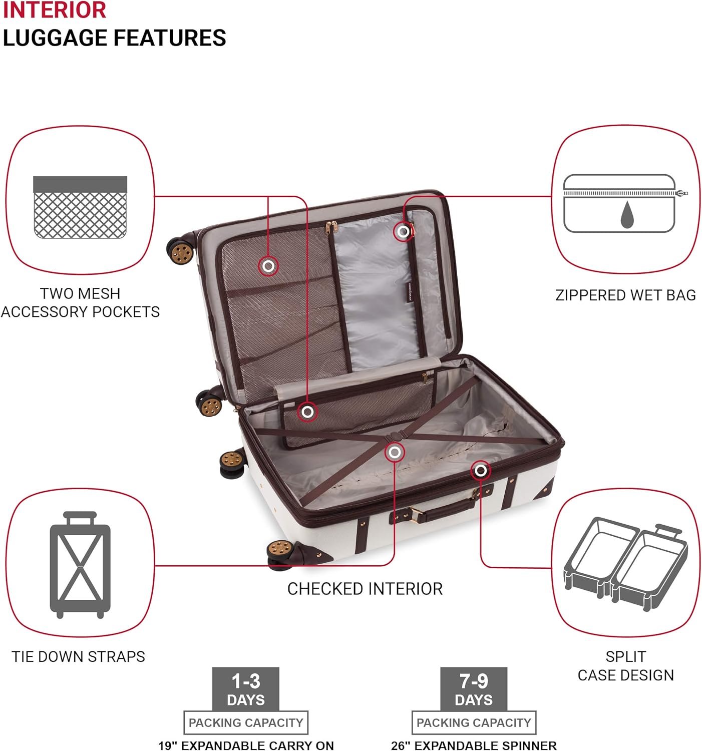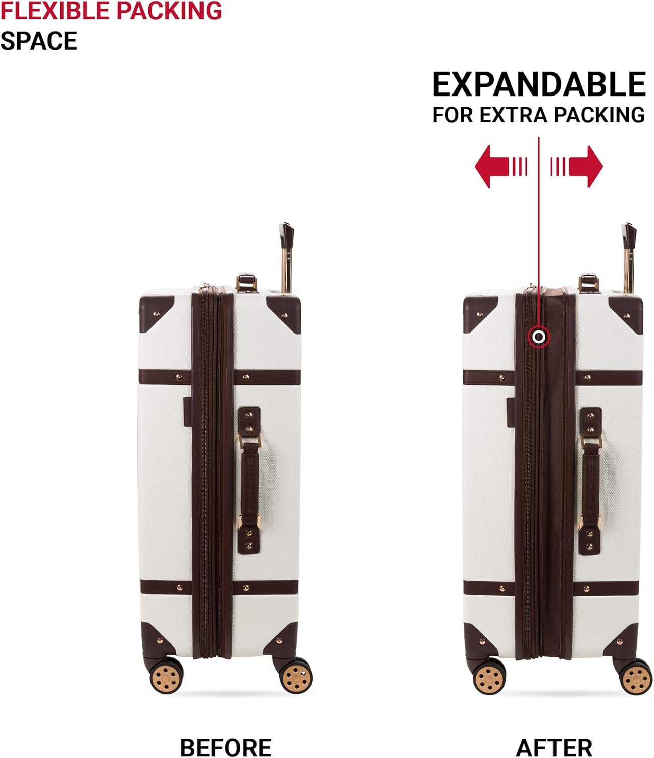 STYLISH DESIGN WITH MAXIMUM PACKING SPACE: A retro case embellished with accent hardware and a stylish stripe design, this boldly rectangular luggage is void of any round sweeping corners or sides, pushing the limits of carrying capacity when compared to other, more commonly found luggage.