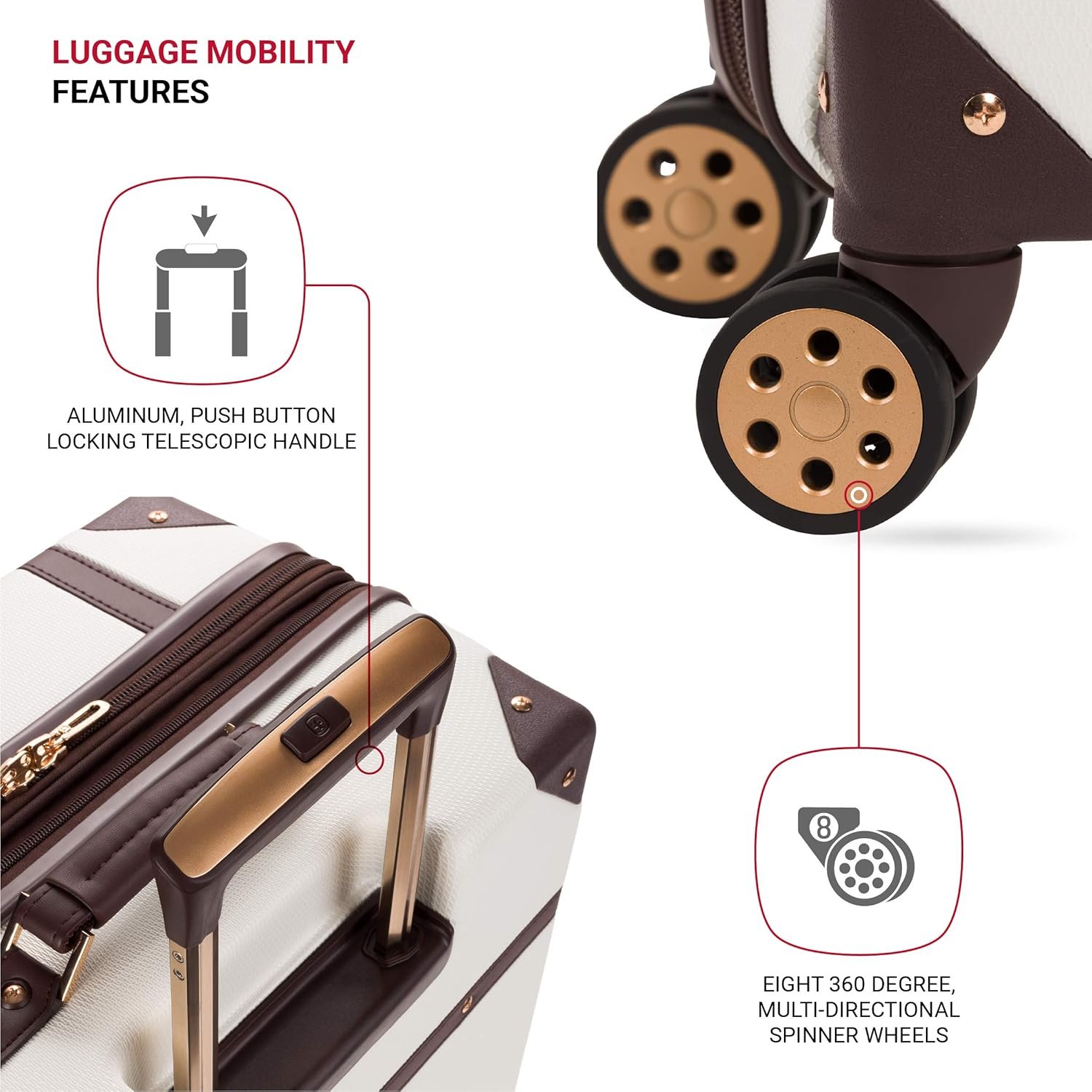 360-DEGREE SPINNER MANEUVERABILITY: Constructed with 8 premium spinner wheels and a locking retractable handle, take advantage of its easy pushing and pulling maneuverability to seamlessly get through a crowded airport or down narrow airplane isles.