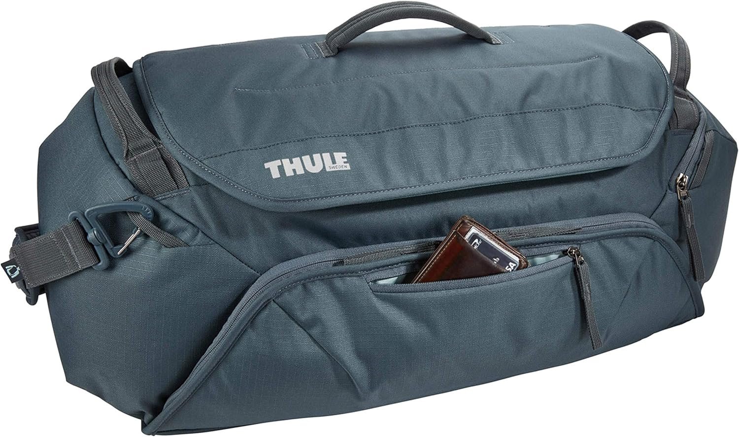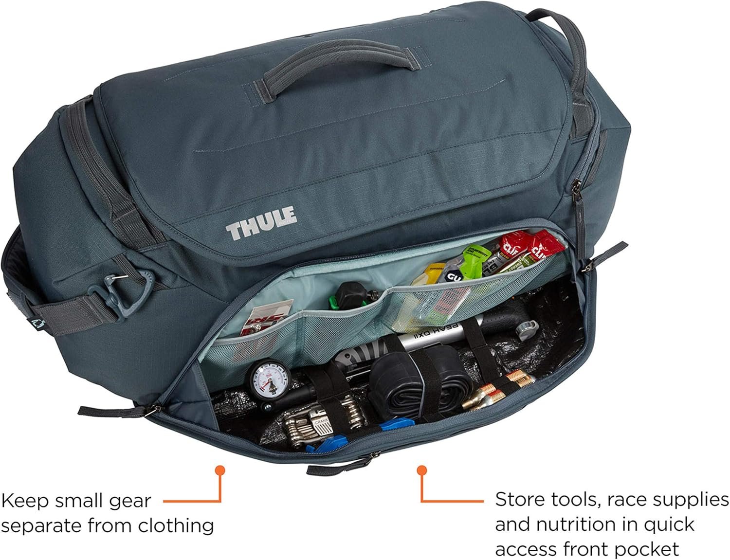 The Thule RoundTrip Bike Duffel is the ultimate bike gear locker for dedicated cyclists. Designed with structured organization, mountain bikers and road bikers alike are able to keep a bag packed and ready with every last piece of gear. Simply swap out fresh wearables while keeping the bag in the trunk of your vehicle to easily access at the trailhead. Purpose-built storage includes individual cell pockets for coordinating kits, jackets and accessories. A dedicated helmet compartment comfortably fits any size road or trail helmet. Tarpaulin lined zippered pockets store shoes and dirty clothing to protect clean clothing from wet or muddy gear. The cycling gear bag is built for quick access with a structured design and wide opening for high visibility and efficient access to all gear. A front pocket keeps nutrition and tools separate from other gear. This race day bag also includes a removable shoulder strap makes it easy to transport from car to hotel or around the race venue.